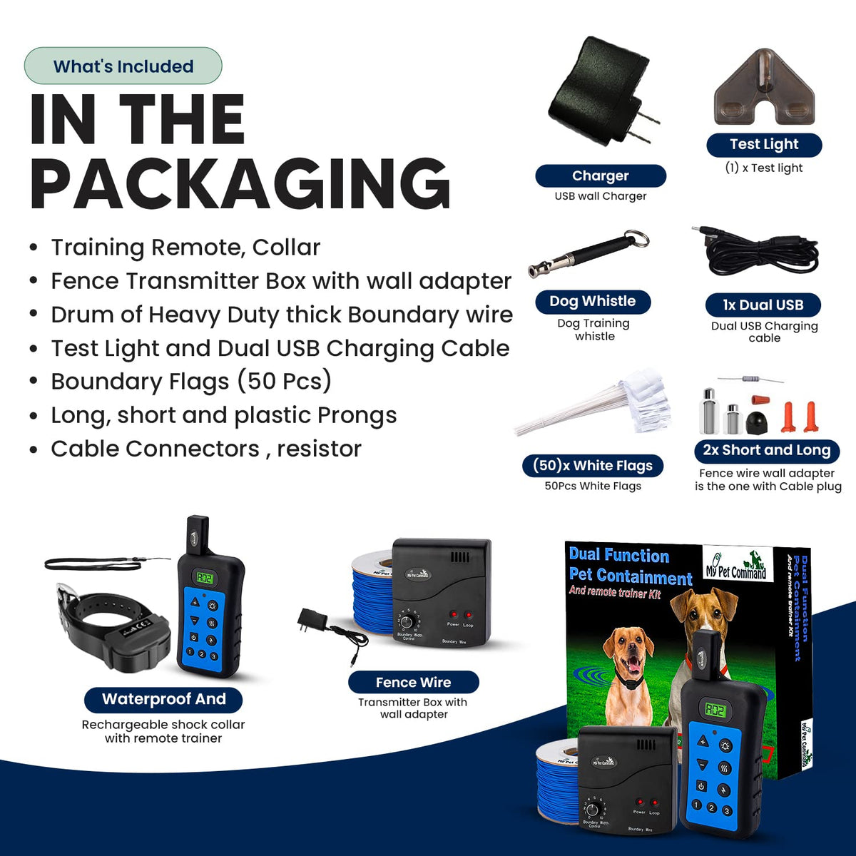 Q: What comes included in the My Pet Command dog fence kit?A: The kit includes a waterproof and rechargeable shock collar, a remote trainer, a dual USB charging cable, a 492 FT (150m) drum of heavy-duty 13 AWG boundary wire, a transmitter with power adaptor, mounting screws, a USB wall charger, collar contact points, cable connectors, a test light, training flags, and a bonus ultrasonic training whistle along with an installation guide.
