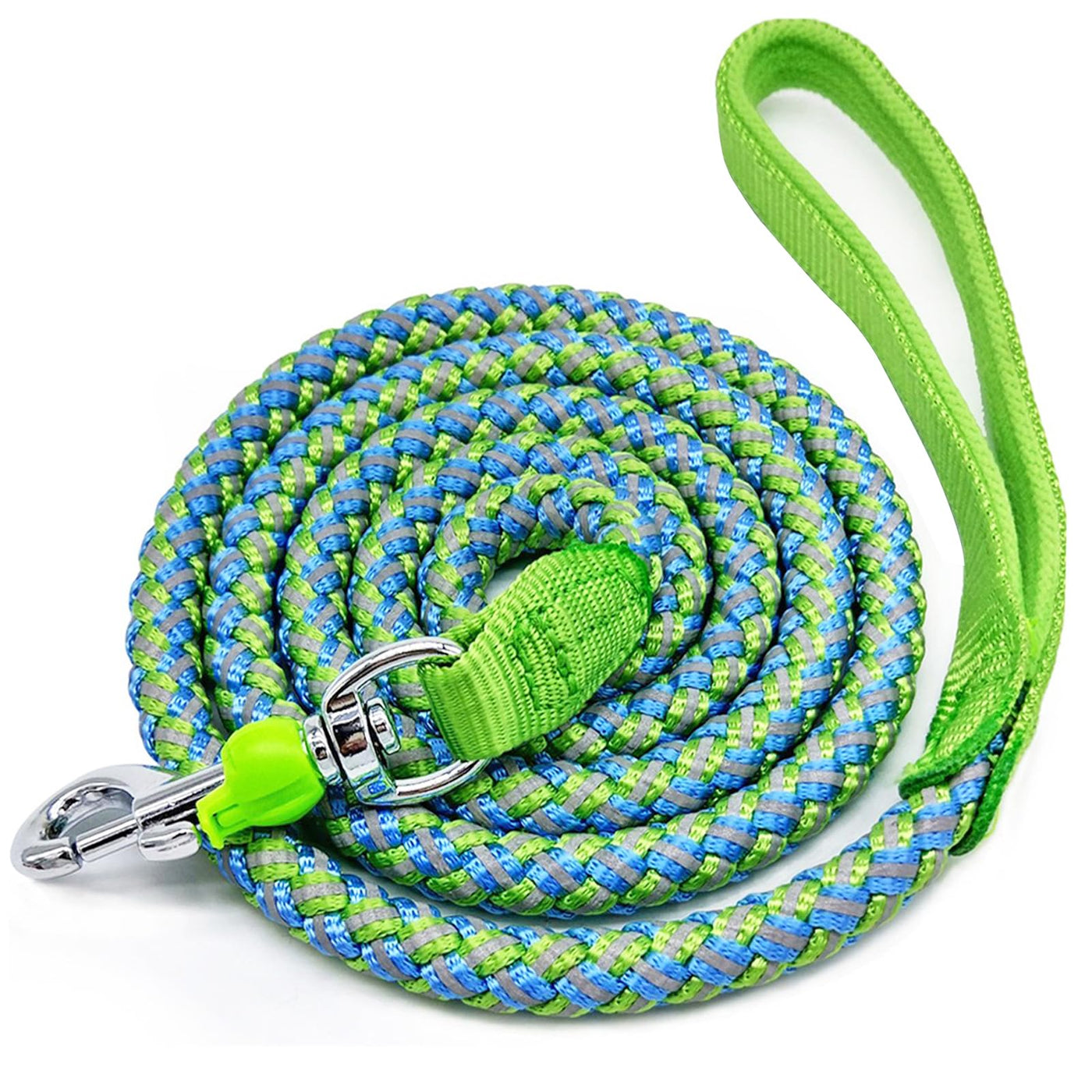 REFLECTIVE THREADS - Braided reflective threads make the dog leash much safer in the night walking when the street lamp or car lighting shoot the threads, it significantly enhance the visibility of the dog leash. Note: The reflective thread will not glow itself. CUSHIONED HANDLE - Heavy duty dogs often pulls you, but dont worry. Padded handle adds super comfort and easier to grip on the long walks, say ''goodbye'' to the rope burn with this comfortable dog leash. HEAVY DUTY: Mycicy heavy duty dog leash is best for large breed and medium size dog (18~120lbs) SIZE: 3ft/ 4 foot/ 6 foot /10 foot long and rope Diameter is 8mm(1/3'') 12mm(1/2'') 18mm(3/4''), Extra durable rope leash is thicker than ordinary rope leashes. Sturdy enough for Small Medium large, XL, and XXL dog breeds - Tested up to 1000 lbs. Color: Pink leash, Red leash, Blue leash, Black leash, Green leash, Baby blue leash. Colorful as show as the picture. Mycicy rope dog leash use a weaving technique that is different from other leash, more durable, more beautiful color matching, more useful with reflective strip.Walk dog comfortable with the softest rope dog leash. These handmade dog leads are made with our real mountain climbing rope and padded is very soft on your hands. The heavy duty snap hook of mycicy rope leash is sturdy and durable and is equipped with a safety lock catch to ensure that you're dog cannot slip out of the climbing rope leash, Perfect for daily use, walking, jogging, running, camping and hiking, or out for a leisurely stroll backyard activities.