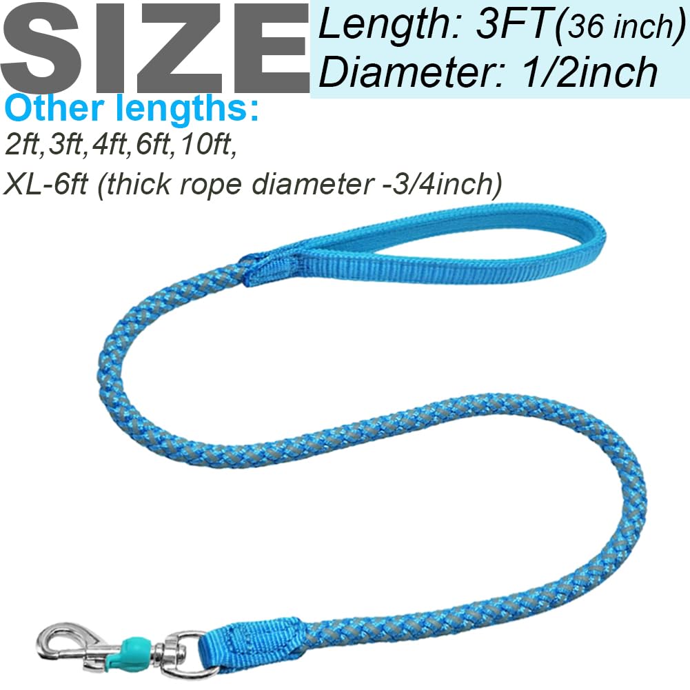 REFLECTIVE THREADS - Braided reflective threads make the dog leash much safer in the night walking when the street lamp or car lighting shoot the threads, it significantly enhance the visibility of the dog leash. Good reflectivity-visibility dog leash. Strong & sturdy reflective leash that should last. The reflective strips are woven throughout the leash so that it is reflective from any angle and when light hits the leash it glows a bright white. Note: The reflective thread will not glow itself. Sturdy Night reflectiveness Good leash, highly visible day or night. Night got to see it reflect in your headlights. The rope portion, completely lit up! Cushioned loop leash , this provides enough cushion without being bulky. thick leash Secure Leash Very reflective in front of car headlights. Very easy to spot when walking in the dark, because the leash is highly reflective under a cars headlights. Very safe!! STRONG: Mycicy heavy duty dog leash is best for large breed and medium size dog (18~120lbs) SIZE: 2FT/ 3ft/ 4 foot/ 6 foot /10 foot long and rope Diameter is 12mm(1/2'') 18mm(3/4''), Extra durable rope leash is thicker than ordinary rope leashes. Sturdy enough for Small Medium large, XL, and XXL dog breeds. Color: Pink leash, Blue leash, Black leash, Green leash, Baby blue leash. Colorful as show as the picture. Braided material design: Mycicy rope dog leash use a weaving technique that is different from other leash, more durable, more beautiful color matching, more useful with reflective strip, is constructed tightly braided with durability nylon rope leash. Strong, light weight and weather proof. Walk dog comfortable with the softest rope dog leash. The heavy duty snap hook of mycicy rope leash is sturdy and durable and is equipped with a safety lock catch to ensure that you're dog cannot slip out of the climbing rope leash, Perfect for daily use, walking, jogging, running, camping and hiking, or out for a leisurely stroll backyard activities. Suitable for Husky, Golden Retriever, Labrador, Teddy, Corgi, Chihuahuas, Cocker Spaniel, Cockapoo, Bulldog, Beagle, Pit Bull, shepherds mountain dog Beagles Poodle Rottweiler Terrier boxer Dachshund Great Dane Doberman Pomeranian Schnauzers Pembroke Welsh Shetland Sheepdogs Mastiffs Spaniels Chihuahuas Pugs Maltese Miniature Collies Basset Hounds Cane Rhodesian Retriever