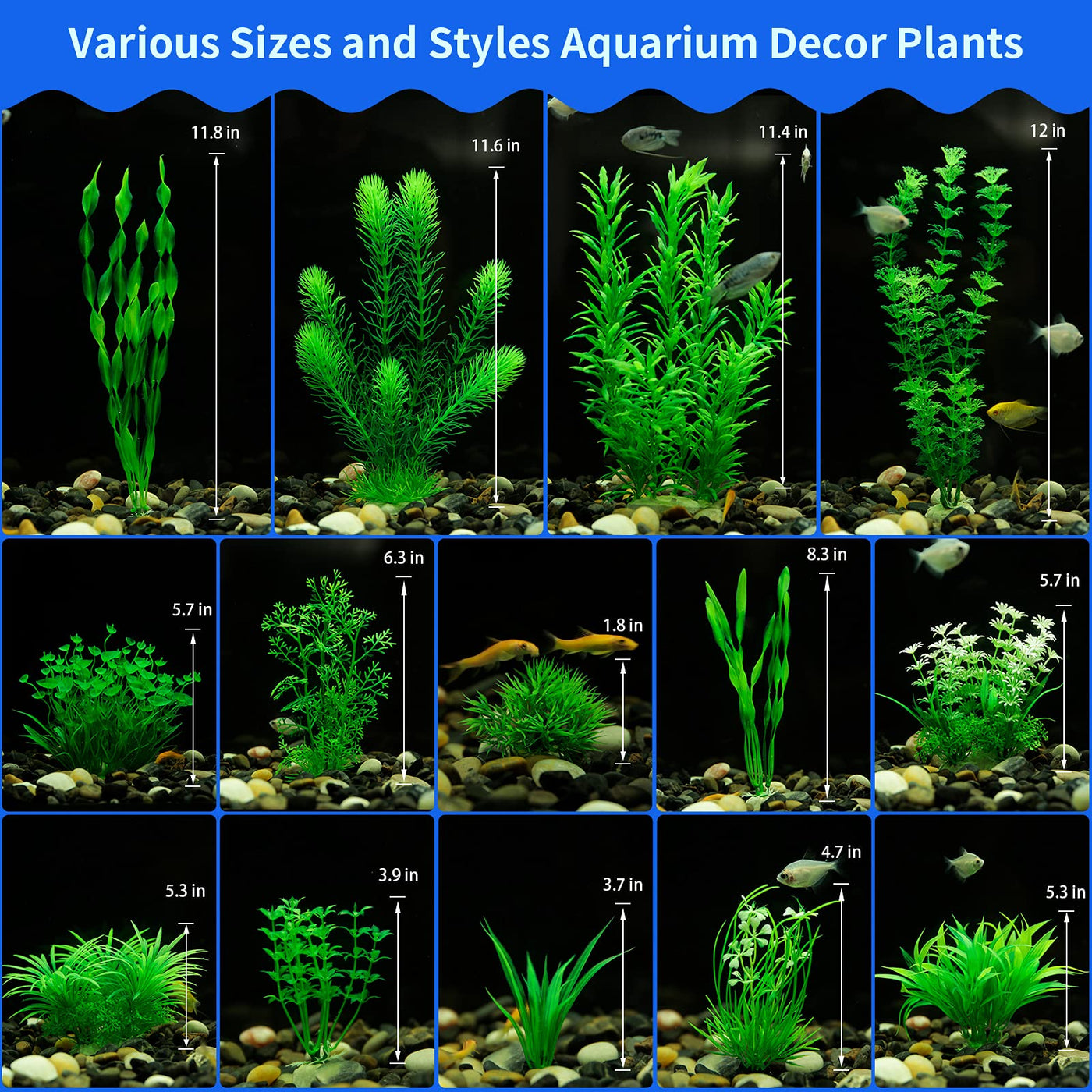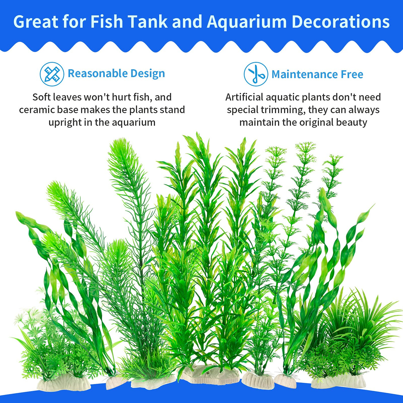 MyLifeUNIT 20 Pack Artificial Green Aquarium Plants Made of eco-free and premium PVC and ceramic material Free from rust and rot, do not affect the PH in fish tank The aquatic plants will make your aquarium more nice-looking Good for both freshwater and saltwater environments Set of 20 artificial seaweeds, from 2 to 12 inches in height