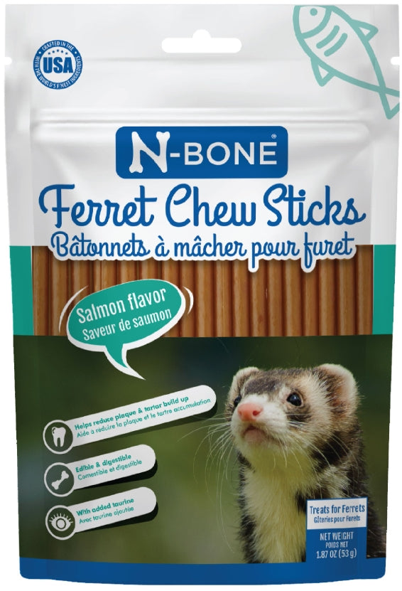 N-Bone Ferret Chew Sticks are soft, pliable treats that outlast most other chew products. Completely edible and made with all natural ingredients and real salmon flavor, Ferret Chew Sticks are a favorite for ferrets of all ages.Natural chew treat with added taurineHelps clean teeth & gumsNo preservatives or artificial colorsOmega 3 & 6 fatty acids support skin and coat healthMade in the USAIngredients: Wheat Gluten, Corn Starch, Vegetable Glycerin, Gelatin, Water, Corn Gluten Meal, Menhaden Meal, Herring Oil (preserved with Mixed Tocopherols), Natural Salmon Flavor, Lecithin, Ginger, Taurine, Rosemary Extract, Mixed Tocopherols (preservative).Guaranteed Analysis:Crude Protein (min) - 35.0%Crude Fat (min) - 4.5%; Crude Fat (max) - 6.0%Crude Fiber (max) - 2.5%Moisture (max) - 15.0%Taurine (min) - 0.05%Omega 3 (min) - 0.60%Omega 6 (min) - 0.10%DHA (min) - 0.20%Calorie Content (calculated): 3150 kcal ME/kg