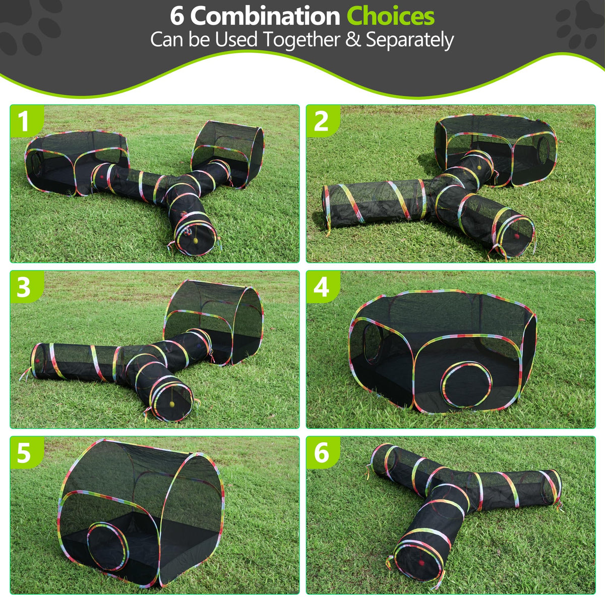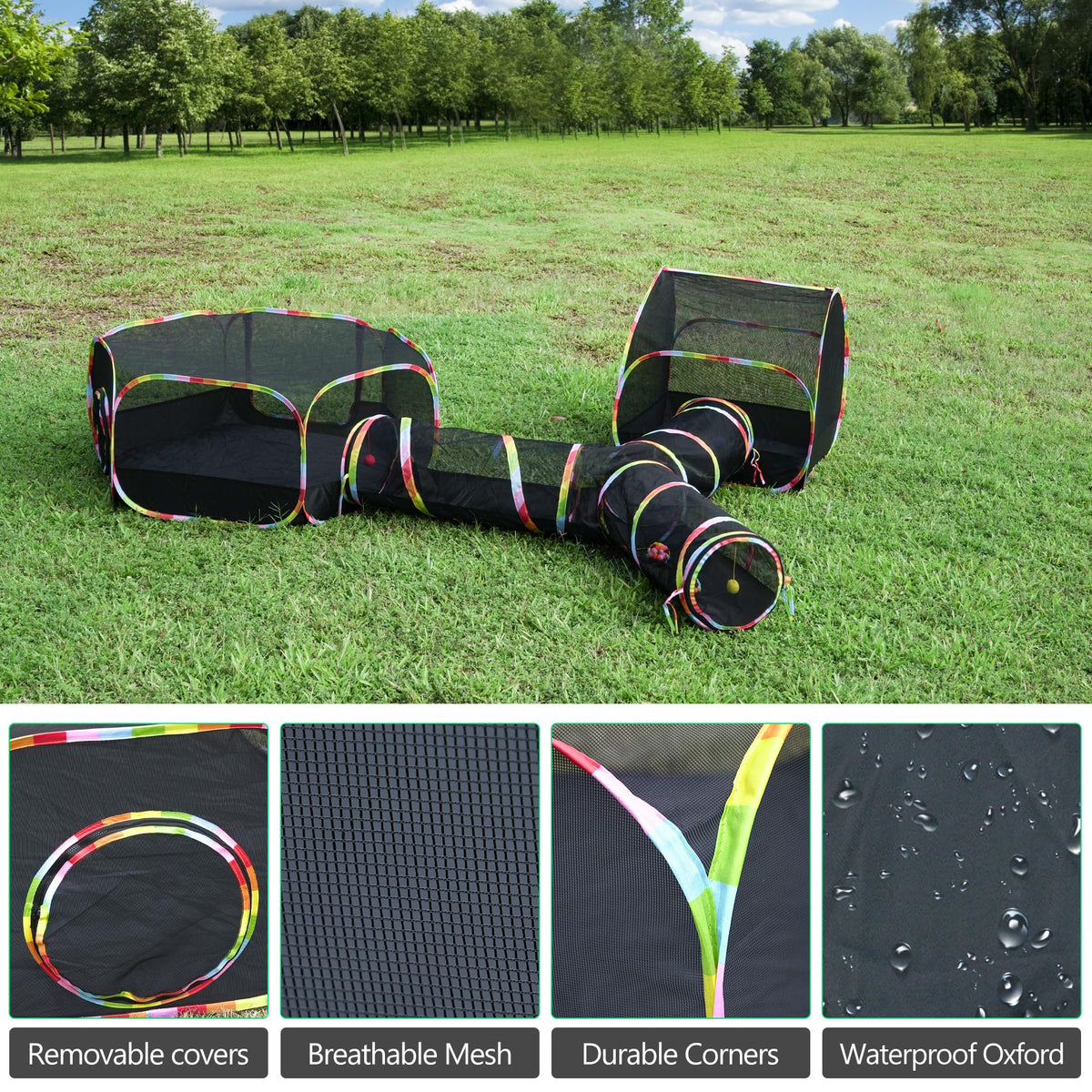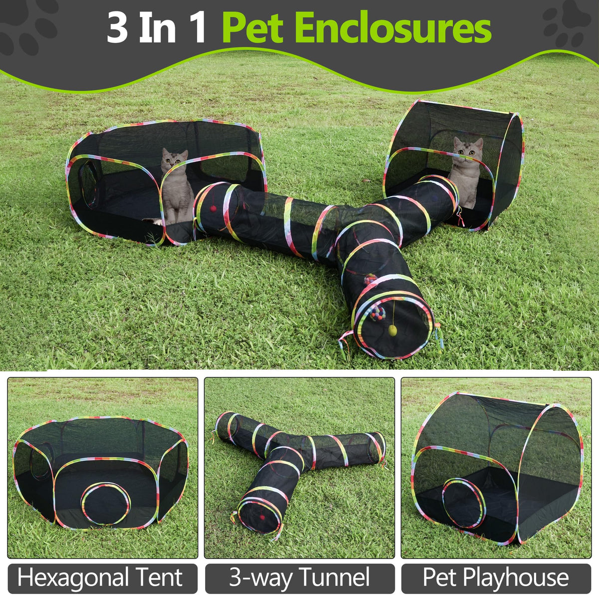 Outdoor Cat Enclosures: The Pet Playpen Has One Cat Tent, One Cat Playhouse, And One 3 Ways Cat Tunnel With Three Balls, Also Come With Two Cat Toy Balls With Bell. The Cat Tent With Two Big Zipper Doors, The Cat Playhouse With One Big Zipper Doors, The Cat Tunnel Can Link To Cat Tent And Playhouse By Zipper For Cats To Play.The Parts Can Be Used Together Or Separately. Large & Spacious: The Tent Dimensions: 47* 47* 18 In, The Playhouse Dimensions: 27* 27*27In, The Tunnel Dimensions: 26* 11In. This Outdoor Pet Catio Is Large Enough For Providing Ample Space For Your Pets To Play And Exercise. The Design Allows Your Pets To Enjoy The Scenery From All Angles, Reducing Boredom. Portable & Easy To Assemble: Come With Simple But Detailed Instructions In Storage Bag, Just Follow The Folding Instructions, Unfolding The Enclosure Is A Breeze And Ready For Setup Within Minutes. The Cat Playpen Is Easy To Assemble And Disassemble, And Can Be Folded Into A Compact Size For Easy Carrying And Storage. The Included Carrying Bag Makes It Convenient To Take The Playpen To The Park, Beach, Or Other Outdoor Places. Safe & Secure: The Playpen Has A Stable Structure And Strong Joints, Which Can Effectively Prevent Pets From Escaping. The Bottom Of The Playpen Is Equipped With Ten Plastic Tent Stakes , Which Can Keep Your Tent From Being Blown Away When Placed Outdoors. Durable: Our Outdoor Cat Enclosures Are Extremely Durable. The Tent, Playhouse And Tunnel Were Made By Mesh And Waterproof Oxford. Mesh Is Breathable And Give Your Cats A Breath Of Fresh Air. Waterproof Oxford Is For Anti-Scratch And Easy To Clean Multiple Uses: The Cat Playpen Is Not Only Suitable For Cats, But Also For Small Dogs, Rabbits, Ferrets, And Other Small Animals. It Can Be Used As A Cat Playpen, Dog Playpen, Pet Training Pen, Or Outdoor Playground.