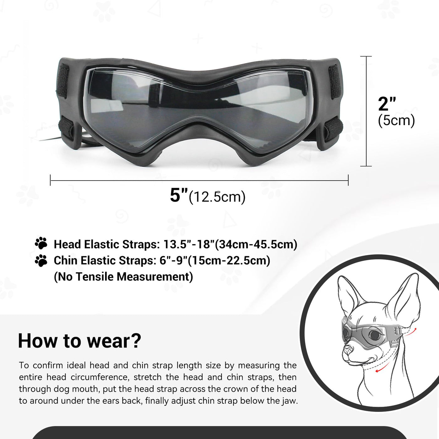 Namsan is dedicated to researching pet supplies, these dog goggles are authorized by Namsan, made of soft TPU frame & UV lens, lightweight and safety. Our dog sunglasses protects eyes from 100% of harmful UV radiation, keep pets eyes safe from direct and peripheral threats with the durable wraparound construction. Professional windproof dustproof dog glasses for motorcycle riding, biking, also don't be afriad of your puppy sticking its head out of the window while driving. Ideal for most small-medium breed dogs, Schnauzer, Corgi, Jack Russell Terrier, Beagle, Yorkshire eyes protection. Air vents would prevent lens fogging, dogs can see better at all times. Lenght: 8', Height: 2'. Head Strap: 13.5'-18', Chin Strap: 6'-9'. Adjustable elastic straps to adapt to fit the size of pet head, so never worry about falling off.