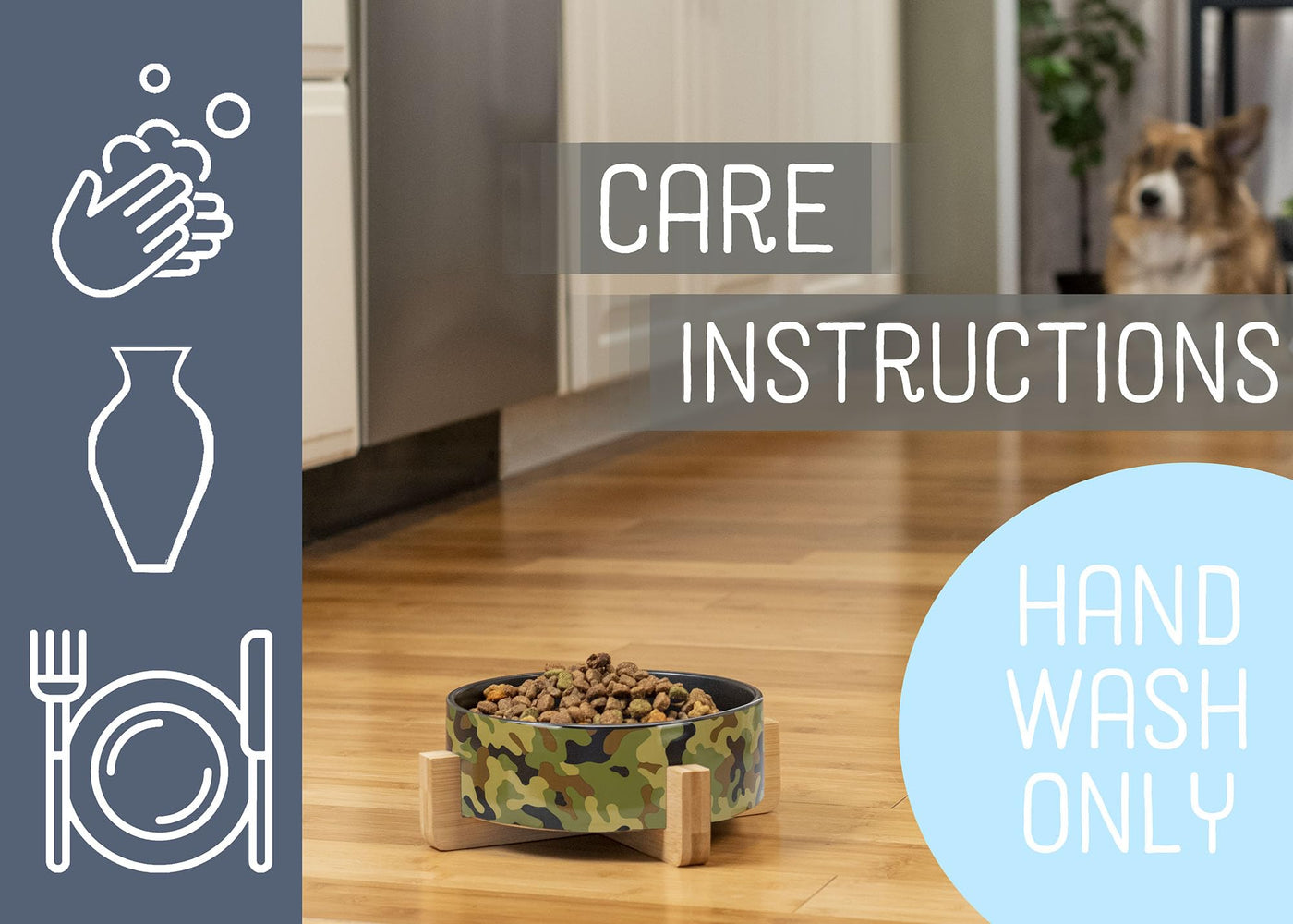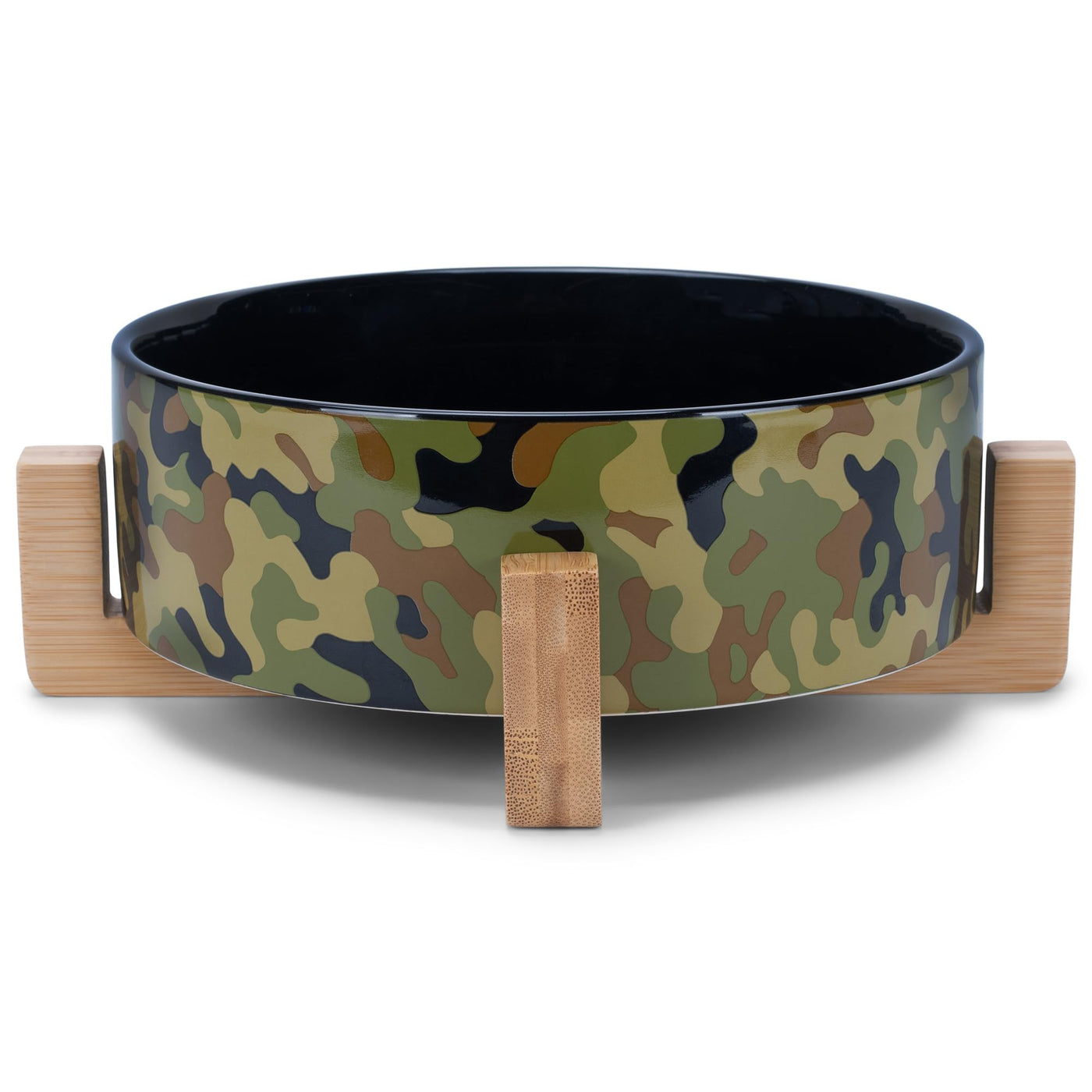 Nat & Jules Large Military Camo 8 Inch Stoneware Ceramic And Wood Pet Bowl With Stand