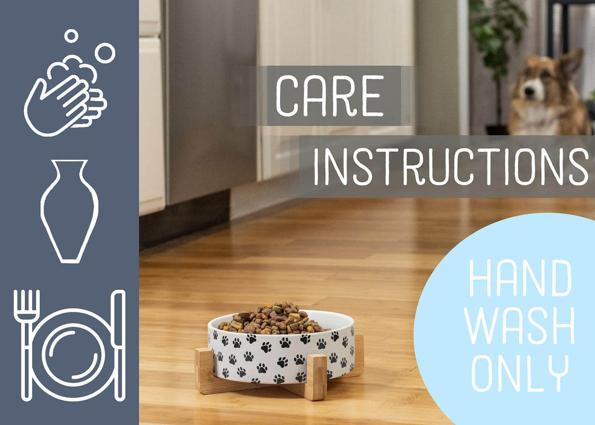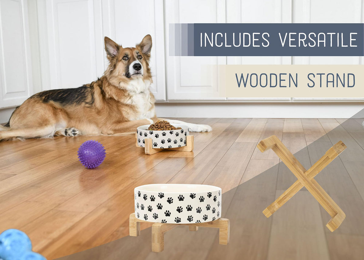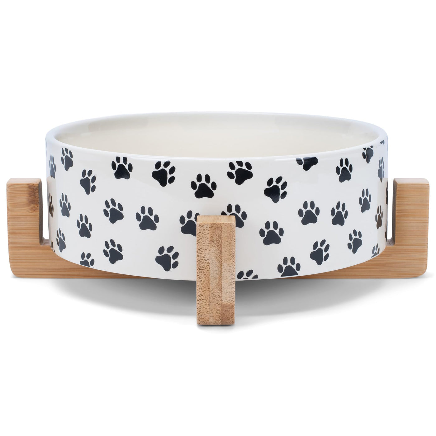 Nat & Jules Large Pawprint Black And White 8 Inch Stoneware Ceramic And Wood Pet Bowl With Stand