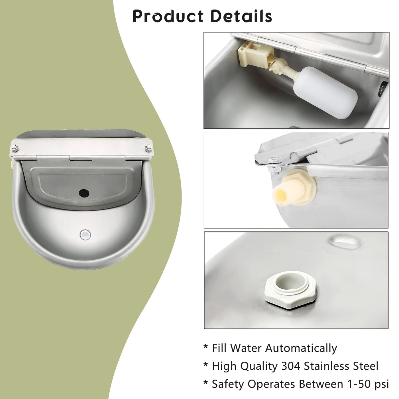 304 stainless steel, durable, no rust, no deformation, clean and sanitary The use of float water level floating principle control the inlet and outlet water switch, to achieve a constant water level effect, keeps enough water and always clean water Smooth edge polished , to avoid traumatic infection the caused by scratching Significantly save more than 30% of the water when cattle drinking, reduce the sewage discharge pressure Large capacity, the diameter increased to 25CM, rear 2 screw fixing holes(not included), easy to fix