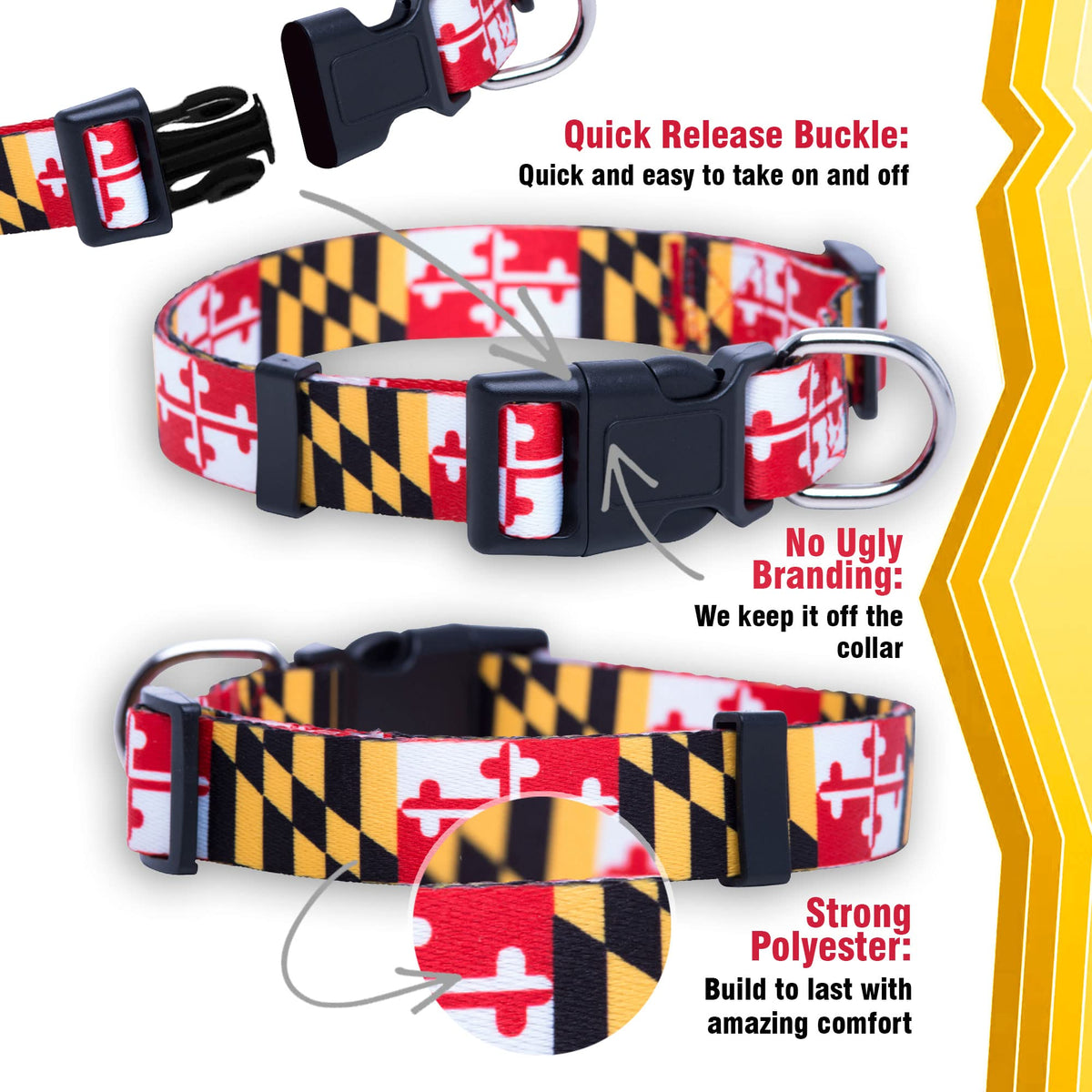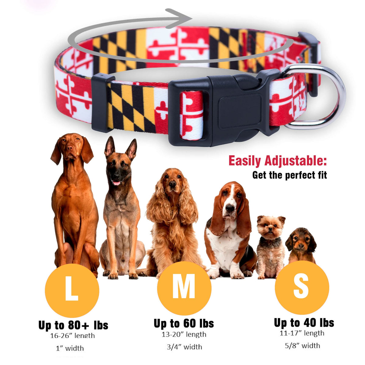 This Maryland Flag Adjustable Dog Collar Will Look Great On Your Native Pup! This Collar Has The Following Features: Easily Adjusted To Fit Most Dog Breeds Colorful Maryland Flag Design Durable Polyester Metal D-Ring And Adjuster To Accurately Get Your Dogs Neck Size, Use Cloth Measuring Tape Or String And Measure Around Your Dogs Neck. Add Two Additional Inches And You Will Have Your Dogs Neck Size! Native Pup Collar Neck Size Common Dog Breeds Extra Small 7-10 Inches Chihuahua, Terriers, Shih Tzu Small 11-15 Inches Beagle, Cocker Spaniel Medium 14-20 Inches Dalmatian, Boxer, Lab, Husky