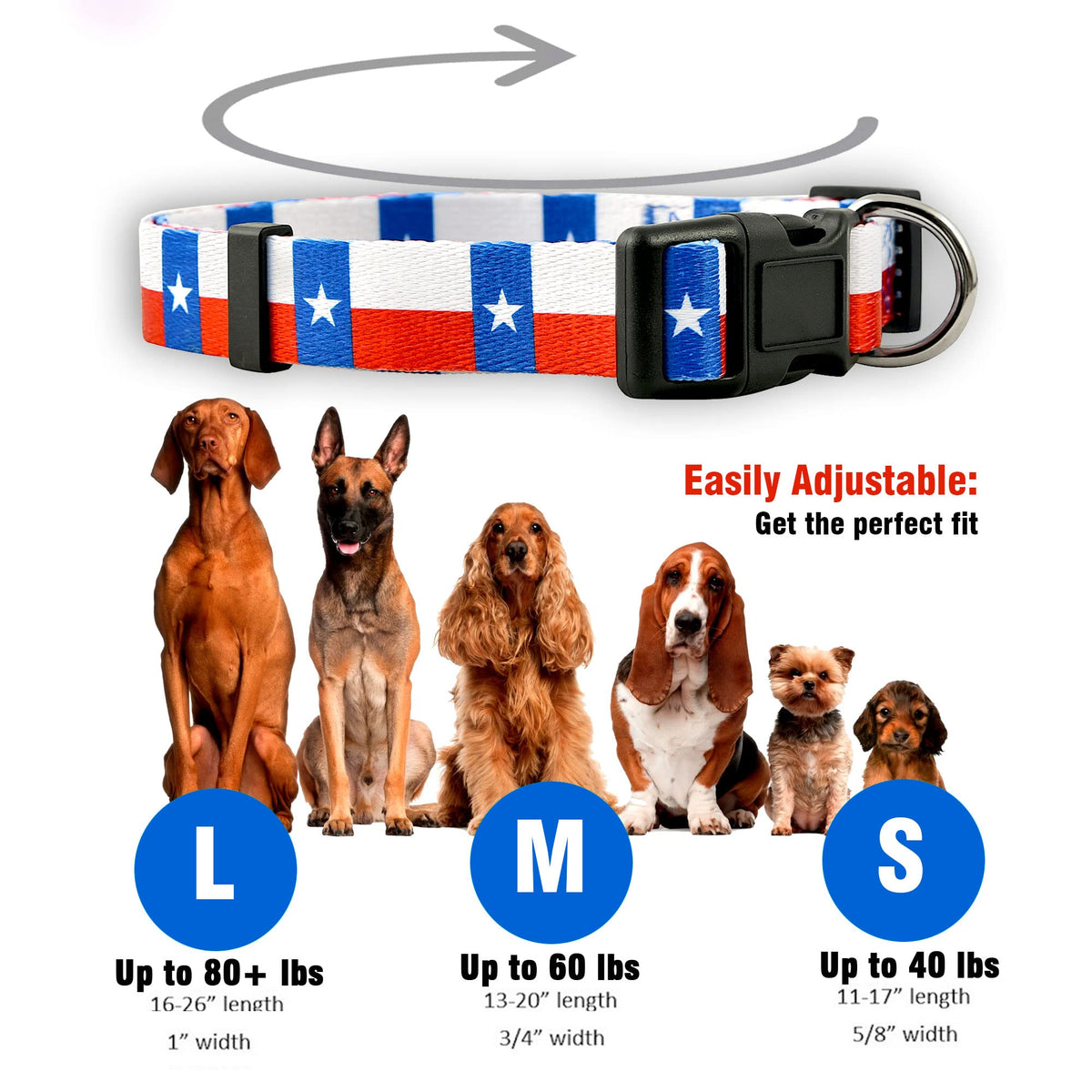 These State Flag Adjustable Dog Collar Will Look Great On Your Native Pup! This Collar Has The Following Features: Easily Adjusted To Fit Most Dog Breeds Colorful Repeating Flag Design Durable Polyester Metal D-Ring And Adjuster To Accurately Get Your Dogs Neck Size, Use Cloth Measuring Tape Or String And Measure Around Your Dogs Neck. Add Two Additional Inches And You Will Have Your Dogs Neck Size! Native Pup Collar Neck Size Common Dog Breeds Extra Small 7-10 Inches Chihuahua, Terriers, Shih Tzu Small 11-15 Inches Beagle, Cocker Spaniel Medium 14-20 Inches Dalmatian, Boxer, Lab, Husky