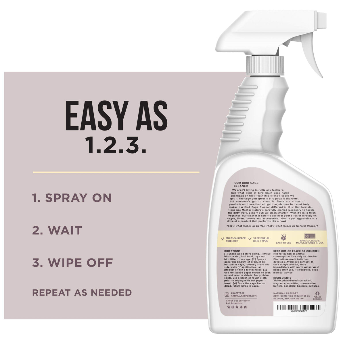 NATURAL CLEANER - Our spray is made with plant-based ingredients making it alcohol, bleach, ammonia, and chlorine free! This makes it safe on cages, liners, covers, and all other accessories. The powerful formula aggressively removes bird waste. | EASY TO USE - The plant-based, bio-enzymatic ingredients in our cleaner breakdown dried, caked-on bird poop. For more difficult enclosures, simply spray on the formula, let it sit and work a miracle. No need for difficult scrubs or brushes. | BEST FOR ANY SURFACE - Our gentle, natural-based cleaning formula removes bird droppings, waste, and odor from any surface, even a window or car. Additionally, the cleaner does not have a chemical smell. It leaves behind a light, fresh scent. | SAFE FOR ALL BIRD TYPES - Safe for all birds, both large and small. This professional-grade concentrated cleaning spray is among leading cleaners. Unlike other cleaning sprays or wipes our spray doesnt leave behind any residue, just gets poop off. | MADE IN THE USA - The Natural Rapport Bird Cage Cleaner and Bird Poop Remover is made entirely in the United States. The spray is also completely manufactured domestically and is a great addition to your arsenal of cleaning supplies and tools.