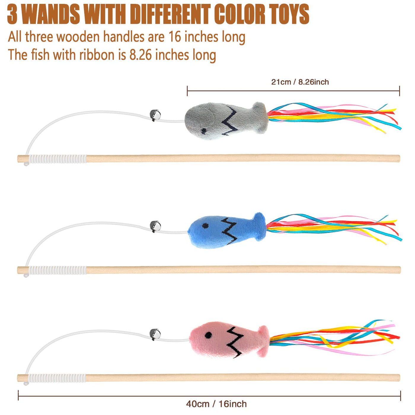 Natural Wood Cat Wand Toy With Ribbon Fish Teaser - 3Pcs, 16 Inch, Indoor Cat Exerciser & Playing Kitten Toy, Bonus 5Pcs Catnip