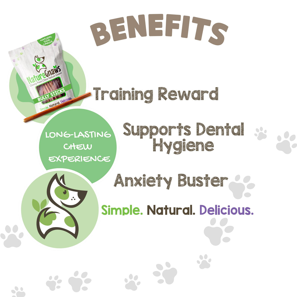 Made with natural premium quality beef pizzle, our Large Bully Sticks are ideal to keep your beloved pup busy and calm. These natural chews are perfect for teething puppies, aggressive chewers, medium and large dogs. Nature Gnaws Bully Sticks are low-odor, grain-free and gluten-free, making them the perfect natural alternative to rawhide bones and manufactured dental chews. Savory snack, the natural act of chewing helps reduce plaque and tartar for cleaner teeth and fresher breath. Promoting overall good dental hygiene, these bully chews are an excellent choice for your pet. Our Beef Chews have a savory thick texture that is the perfect reward to occupy and entertain. Your dog will love the natural scent and tasty beef flavor of our chews. As a family-run business, we are dedicated to providing 100% natural dog chews, bones and treats made with responsibly sourced ingredients to ensure they are the best simple, natural, and delicious products for your beloved pups.