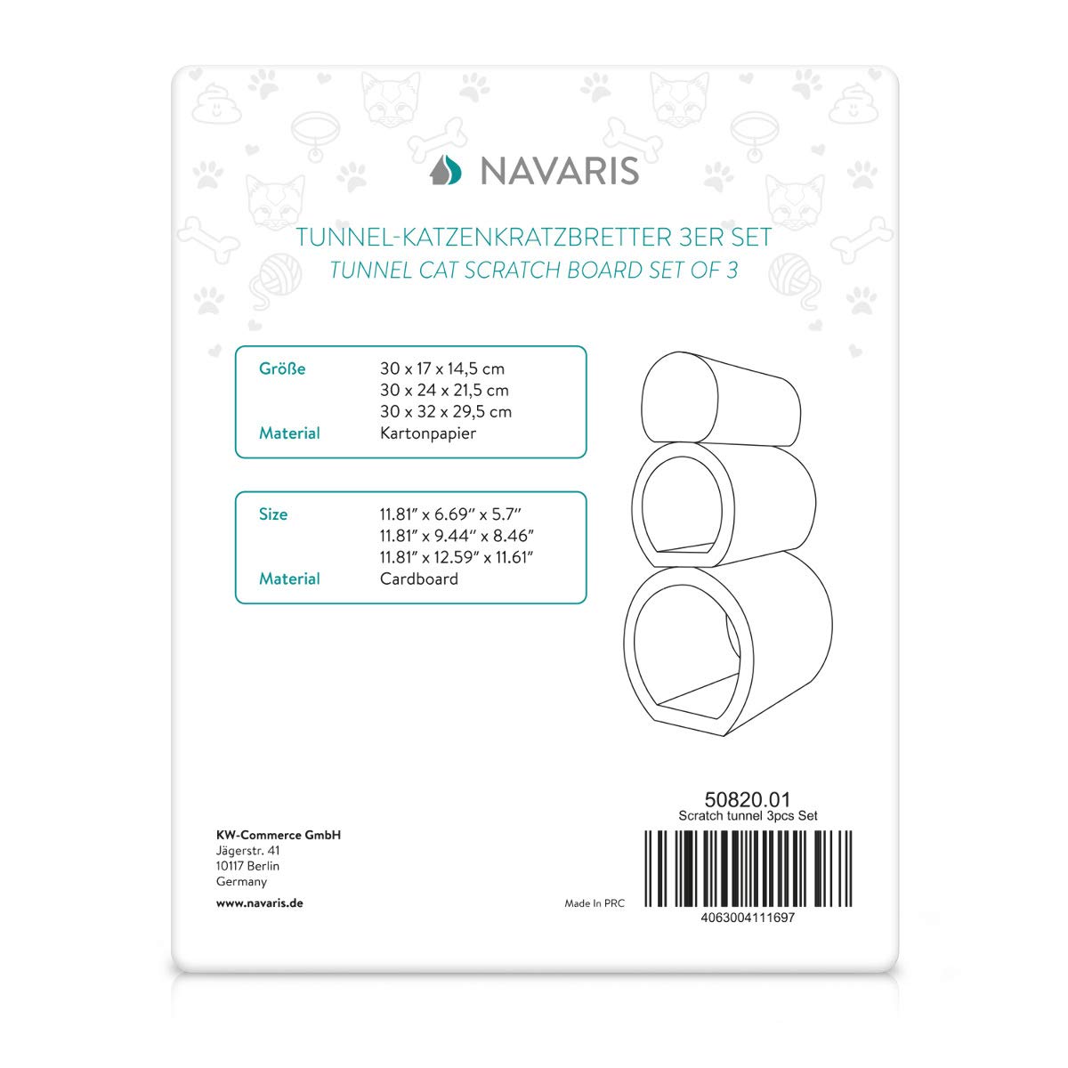 Q: What are the dimensions of the Navaris Cat Tunnel Scratcher Set?A: The larger tunnel measures 30 x 32 x 29.5 cm (11.8 x 12.6 x 11.6 inches), the smaller tunnel is 30 x 24 x 21.5 cm (11.8 x 9.4 x 8.5 inches), and the roll measures 30 x 17 x 14.5 cm (11.8 x 6.7 x 5.7 inches).