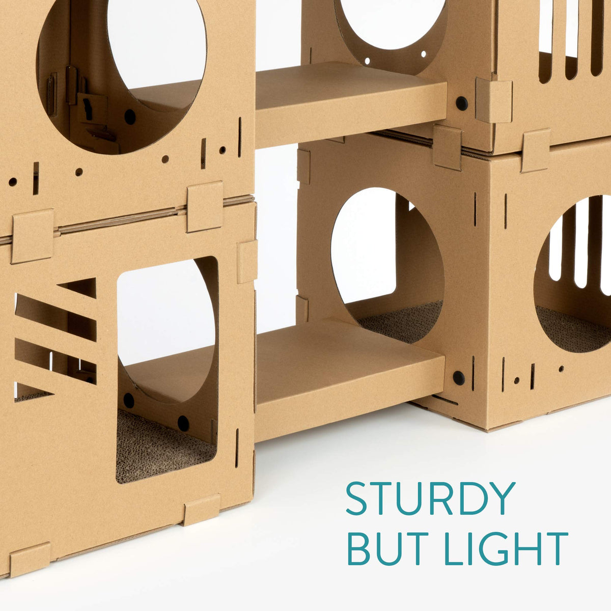 Q: How sturdy is the cardboard used in this cat house?A: Once assembled, the corrugated cardboard structure is quite sturdy and can withstand the playful activities of your pets, such as jumping and climbing.