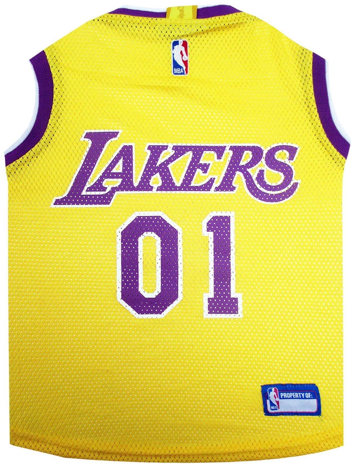 • Q: What sizes are available for the NBA Los Angeles Lakers Dog Jersey? A: The NBA Los Angeles Lakers Dog Jersey is available in six sizes: X-Small, Small, Medium, Large, X-Large, and XX-Large. To select the correct size, measure your pet from the nape of the neck to the base of the tail and refer to the size chart provided in the images.