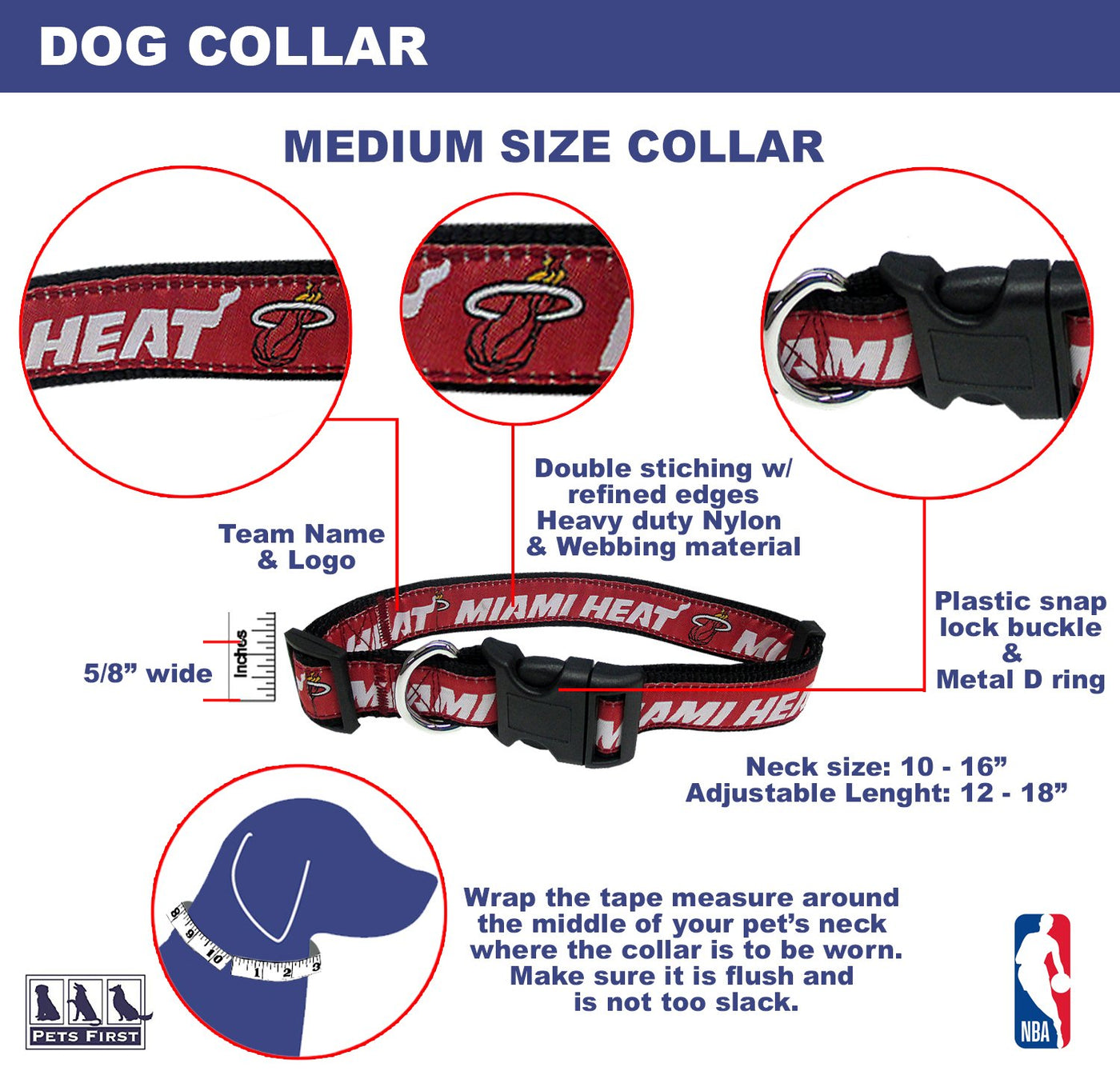 Your Pet Will Become A #1 Fan With This Officially Licensed Nba Pet Collar. Your Pet Will Surely Be Able To Show Off His/Her Team Spirit With This Unique Nba Dog Collar.This Pet Collar Will Bring Fun And Excitement To You As Well As To Your Four Legged Sports Fan!!!Dog Collar Features:This Nba Collar Is Made With Heavy-Duty Nylon Material To Ensure Durabilitythis Sporty Collar Features Your Favorite Team'S Name & Logo In Vibrant Team Color!This New Sports Collar Is Adjustable For A Perfect And Comfortable Fitour Nba Pet Collar Has A D Ring On The Collar To Attach Your Leash To The Collar!Sizing:This Cutest Dog Collar Comes In 3 Sizes; Small Dog Collars, Medium Dog Collars & Large Dog Collars.For The Best Fit, Please Follow The Illustrated Size Chart Located In Image #2 And Match Your Pet'S Neck To The Correct Size From The 3 Available Sizes!By Following The Size Chart You Are Sure To Avoid Returns & Frustration!Score A Basket With This Authentic Pet Collar So Your Entire Family Is Ready For Game Day! ---> Great As A Gift To Your Loved Ones Too!This Fashionable Collar Will Look Great On Your Puppy & It Will Look Even Better With Our Matching Nba Pet Gear!Whether You Want To Show Off Your Team Of Spirit Or Getting Ready For Game-Day, We'Ve Got You Covered!Hey, You Aren'T Done Yet...Please Try Our Matching Pets First Nba Jersey, Pets First Nba Leash, Pets First Nba T-Shirt, Pets First Nba Pet Toys... Also Check-Out Our Pets First Nba Bandana For Dogs & Cats!Choose The Correct Size And Your Favorite Team, And Just Add To Cart Now!Get Ready For Some Basketball With A Cute Pet Outfit That Includes Printed Team Name, Logo And Numbers Of Your Favorite Nba Team.Now You Can Go On A Walk With Your Dog In Style!!Love To Match??While You Buy This Coolest Collar For Your Pet, Why Not Buy Our Matching Pets First Nba Pet Gear?Nba Dog Reversible Bandanas - Comes In 2 Sizes In A Beautiful Sporty Design & Has A Two Sided Gorgeous Embroidery & Screen-Printed Name Of Your Favorite Nba Basketball Team.Nba Dog Leashes - Comes In 3 Sizes With Your Favorite Nba Team Design.Nba Dog Jerseys - Comes In 6 Sizes With A Screen-Printed Name & Number Of Your Favorite Sports Team - My Favorite Too!Nba Dog Tee Shirts - Comes In 5 Sizes With Your Favorite Nba Team Name, Number, Logo & Color. Also Available In Pink!Nba Dog Toys - Too Many To List The Here! Buy The Whole Nba Pet Collection & You Are Sure To Be Ready For Another Great Win!!!* Don'T Forget To Check Out Our Premium Training Pads, Aka The Best Puppy Pads Sold On Amazon!This Pet Cheerleader Skirt Comes In Many Nba Teams:Atlanta Hawks, Boston Celtics, Brooklyn Nets, Charlotte Hornets, Chicago Bulls, Cleveland Cavaliers, Dallas Mavericks, Denver Nuggets, Detroit Pistons, Golden State Warriors, Houston Rockets, Indiana Pacers, La Clippers, Los Angeles Lakers, Memphis Grizzlies, Miami Heat, Milwaukee Bucks, Minnesota Timberwolves, New Orleans Pelicans, New York Knicks, Oklahoma City Thunder, Orlando Magic, Philadelphia 76Ers, Phoenix Suns, Portland Trail Blazers, Sacramento Kings, San Antonio Spurts, Toronto Raptors, Utah Jazz.Choose Your Team And Add To Cart Now!Pets First:Pets First Company Has Established Itself As The Largest Sports-Licensed Pet Product Company In The Country* Pets First Has Gained Its Reputation In Providing Every Pet Owner With Premium Licensed Pet Products; From Unique And Colorful Apparel Items To Fun And Playful Toys And Accessories.* Working With The Latest Technology, Our Creative Designers Choose From The Highest Quality Materials To Provide Durable, Unique And Innovative Pet Merchandise.Our Factories Follow The Highest Standards Of Safety Guidelines To Ensure Your Pets Security, While Providing A Long-Lasting Product.Licenses:Pets First Has Secured Licenses With Major League Baseball (Mlb), Major League Baseball Players Association (Mlbpa), The National Football League (Nfl), National Football League Players Association (Nflpa), National Hockey League (Nhl), National Basketb