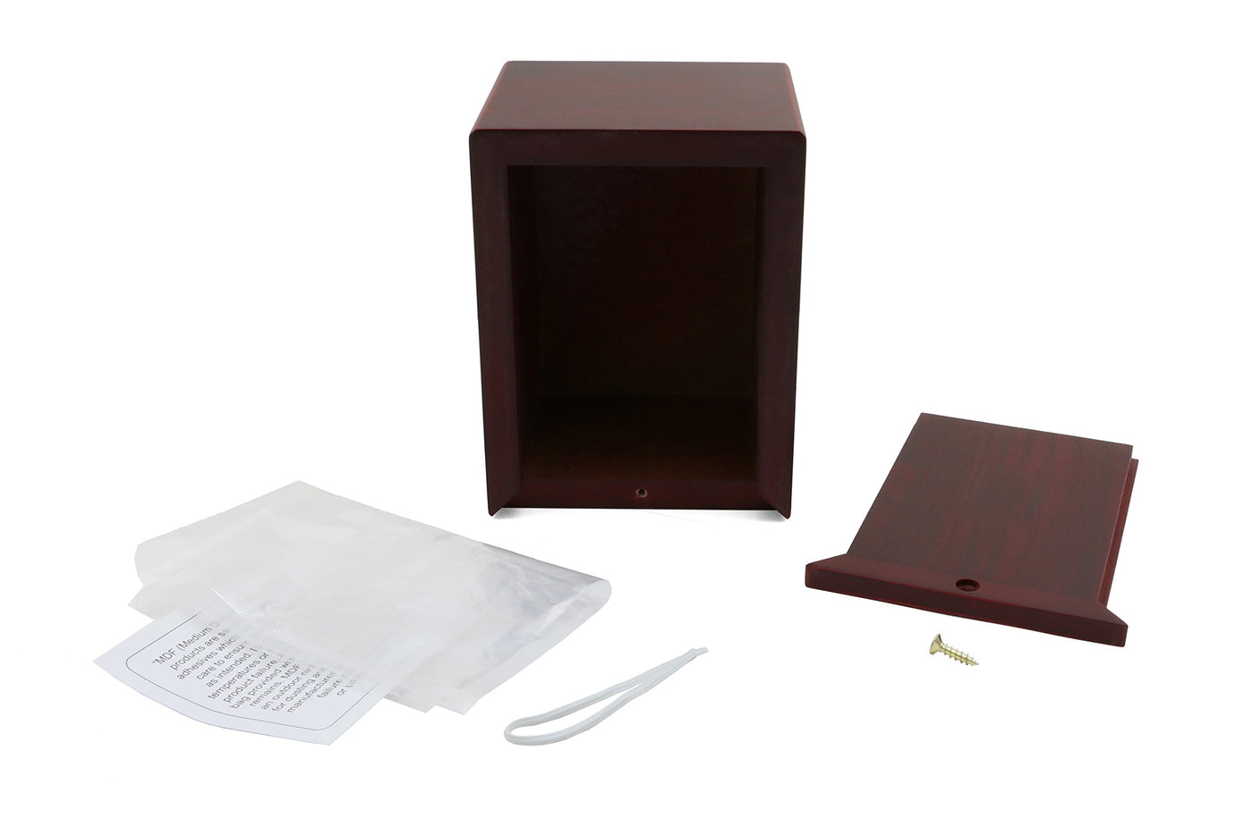 The Near and Dear MDF Pet Cremation Photo Urns, made of medium density fiberboard, are available in a natural grain, cherry and black stained finishes. The unique design allows families to easily insert or exchange photos without opening the urn compartment. The photo window area measures 3-1/4 Inch by 5-1/4 Inch. These urns are available in 4 sizes and we highly recommend that a plastic bag and twist tie (included) be used to secure your pet's ashes held in this urn. Please use only a soft dry cloth on this product for routine dusting.