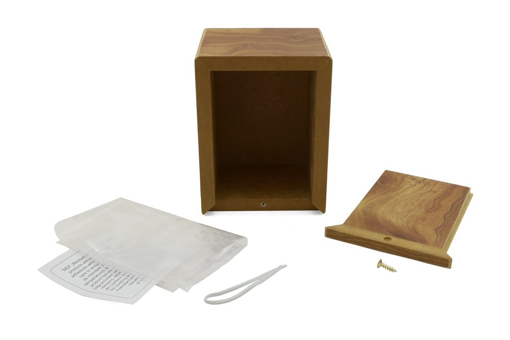The Near and Dear MDF Photo Urns, made of medium density fiberboard, are available in a natural and black stained finishes. The unique design allows families to easily insert or exchange photos without opening the urn compartment. The photo window area measures 3-3/4 Inch by 5-1/4 Inch. These urns are available in 3 sizes and we highly recommend that a plastic bag and twist tie (included) be used to secure your pet's ashes held in this urn. Please use only a soft dry cloth on this product for routine dusting.