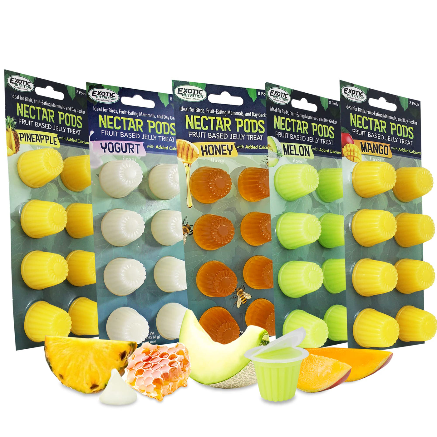 Exotic Nutritions Nectar Pods are a fruit-based, jelly treat. Offering your pet a delicious treat has never been easier! WHAT YOU GET: 5 packs, 8 individual pods per pack, 40 pods total FEATURES:? EASY TO FEED - Nectar Pods are conveniently packages as single servings.? HEALTHY - The exotic fruit flavors & added calcium make Nectar Pods the ideal treat for birds, fruit-eating mammals, and day geckos? LONG SHELF LIFE - Unopened pods store unrefrigerated for months for convenient use.? VARIETY - Lend variety to an otherwise monotonous diet.? TRAINING - Assist in training by allowing you to reward your pet.? BONDING - Form a connection between pets and owners.? ENRICHMENT - Add behavioral enrichment. INGREDIENTS: Water, Sugar, Fructose, Carrageenan, Agar-Agar, Glycine (amino acid), Apple Juice from Concentrate, Calcium Lactate, Artificial Pineapple Flavor, Titanium Dioxide (color), FD&C Yellow 5, FD&C Blue 1, Citric Acid (preservative), Sodium Citrate GUARANTEED ANALYSIS: crude protein (min) 0.50%, crude fat (min) 0.40%, crude fiber (max) 0.20%, moisture (max) 74.00%, calcium (min) 0.77%, phosphorus (min) 0.37%, glycine (min) 0.15% FEEDING INSTRUCTIONS: Offer 1 pod, 2-3 times per week, as a treat. Place within Exotic Nutritions Nectar Pods Holder or Nectar Pod Forager. Or remove top and place pod in your pets food dish, or squeeze contents out into a feeding dish. Always dispose of plastic pod shell after use, and monitor pets if plastic shell is put within the cage. STORAGE INSTRUCTIONS: Store unused pods in a cool, dark, dry place. Dispose of opened pods after 12 hours. ANIMALS: Loved by sugar gliders, day geckos, parrots, hamsters, squirrels, marmosets, kinkajous, fruit-eating mammals, birds, reptiles, lizards, turtles and more.