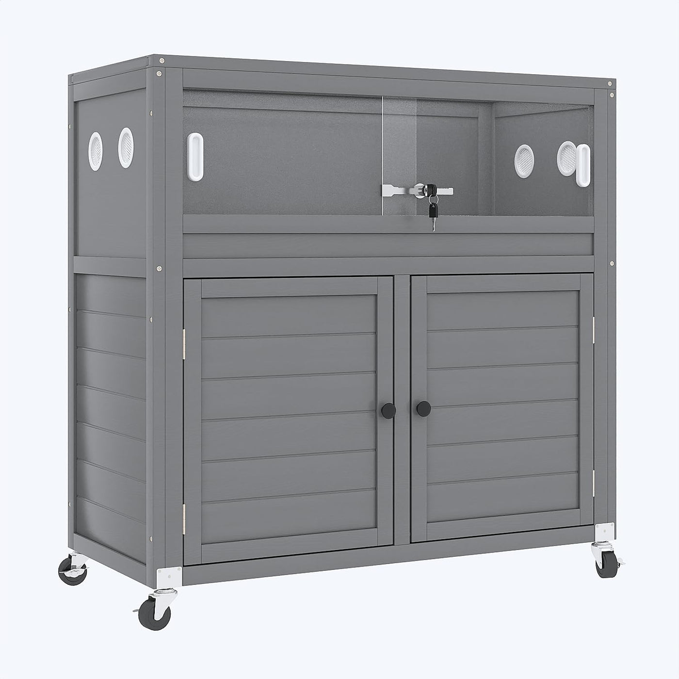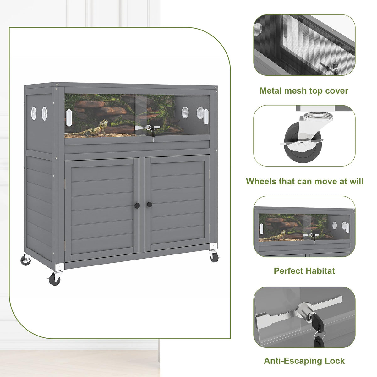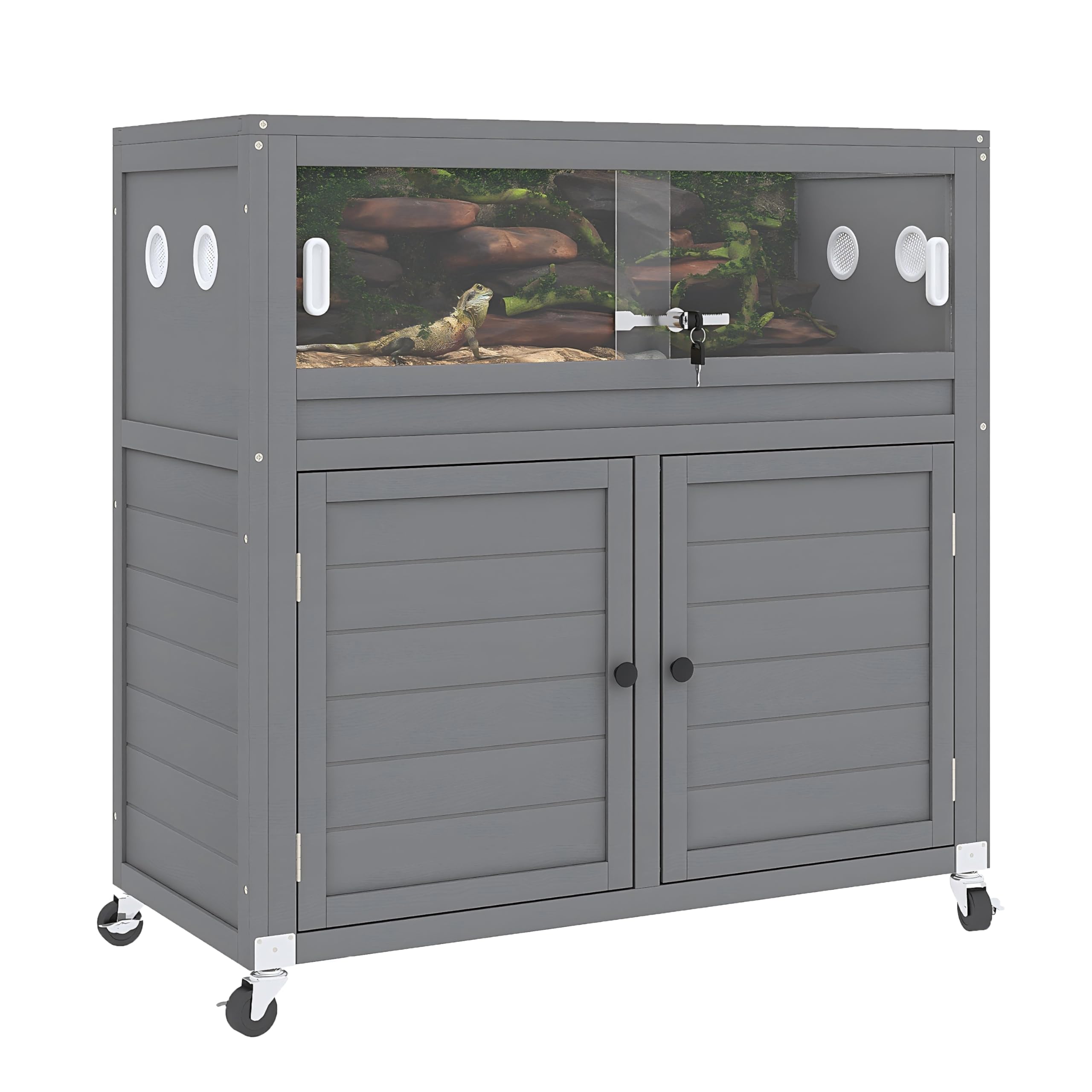 Premium Reptile Terrarium with Storage Cabinet - Durable, Eco-Safe & Versatile Designed for reptile lovers, this Multi-Functional Terrarium combines eco-conscious materials with modern aesthetics. Its sleek dark gray design features a transparent habitat atop a storage cabinet with handles and decorative side vents, all on wheels for effortless mobility. Key Features: Eco-Safe & Durable:Built with New Zealand pine and multi-ply panels, paired with impact-resistant PVC for clarity. Non-toxic and moisture-proof for pet safety. Secure 30-Gallon Habitat:35.4 ''L x 15.7 ''W x 35 ''H enclosure with 92% light transmittance and escape-proof locks. Not water-safe. Controlled Environment:Heat-resistant mesh top supports UV/heat lamps and ventilation. Airflow vents reduce odors. 50-lb Storage Cabinet:Adjustable, removable shelves organize supplies. Sleek handles blend functionality with style. Easy Mobility & Setup:Four wheels move the 35.27-lb unit smoothly. Includes labeled parts and instructions. Specifications: Volume: 30 gal Dimensions: 35.4 ''L x 15.7 ''W x 35 ''H Weight: 35.27 lbs Materials: Pine, multi-ply panels, PVC, metal mesh Ideal for Snakes,Lizards,Geckos and Bearded Dragon, this Eco-Friendly Habitat Series terrarium merges practicality with modern design-all in one compact unit.