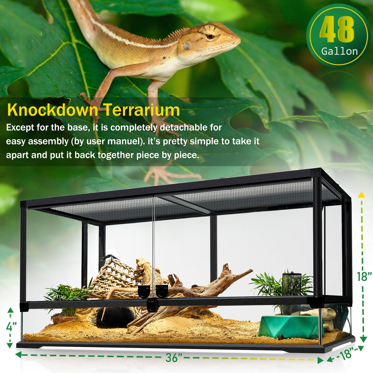 Neptonion Reptile Terrariums Make It Easy To Feed And Care For Your Pets, While Also Keeping Them Comfy And Secure.A Reptile Enclosure Is Very Vital For Your Reptilian Pets, Its Not Just The Exotic Flair You Need For Your Tropical Jungle Aesthetic. Case In Point, A Simple Diy Terrarium Falls Short Of Providing The Best Environment. Reptile Pet Parents Should Know That Their Little Crawlers Cant Simply Live In A Cardboard Box. You Need A Neptonion Terrarium, Pronto!Why A Reptile Enclosure Is Important Reptiles Are Animals That Require A Specific Type Of Environment For Them To Thrive. If You Think They Can Survive Solely In An Underwater Ecosystem - Then You Are Thinking Wrong. Reptiles Are Cold-Blooded Creatures That Need Ample Humidity, Temperature, And Space To Live Their Best Lives. Why Choose Us? - Ventilation Screen:The Easy-To Remove Screen Top Can Be Secured By Using The Four Pivoting Locks At The Side. It Allows Maximum Penatration Of Visible Light, Ultra Violet And Infrared Radiation. - Water-Proof Base:It Can Hold Water Up To The Glass Door, Every Terrarium Is Tested For Leaks. This Is Especially Great For Reptiles That Like To Soak And May Spill Water From Their Bowls. Tank Size And Species Will Determine The Style And Strength Of The Light Fixture. The 36''X18''X18'' Terrarium Are Usually Fitted For Strip Lights(T8 Tube) And 24''X18''X24'' Terrarium For Dome Lamps, With Bulbs Of Varying Strengths Made For Each One. Package Included : 43 Gallon Terrarium X 1Background X 1Rattan Strip X 1Gold Thread Leaf X 1Conch Leaf X 1
