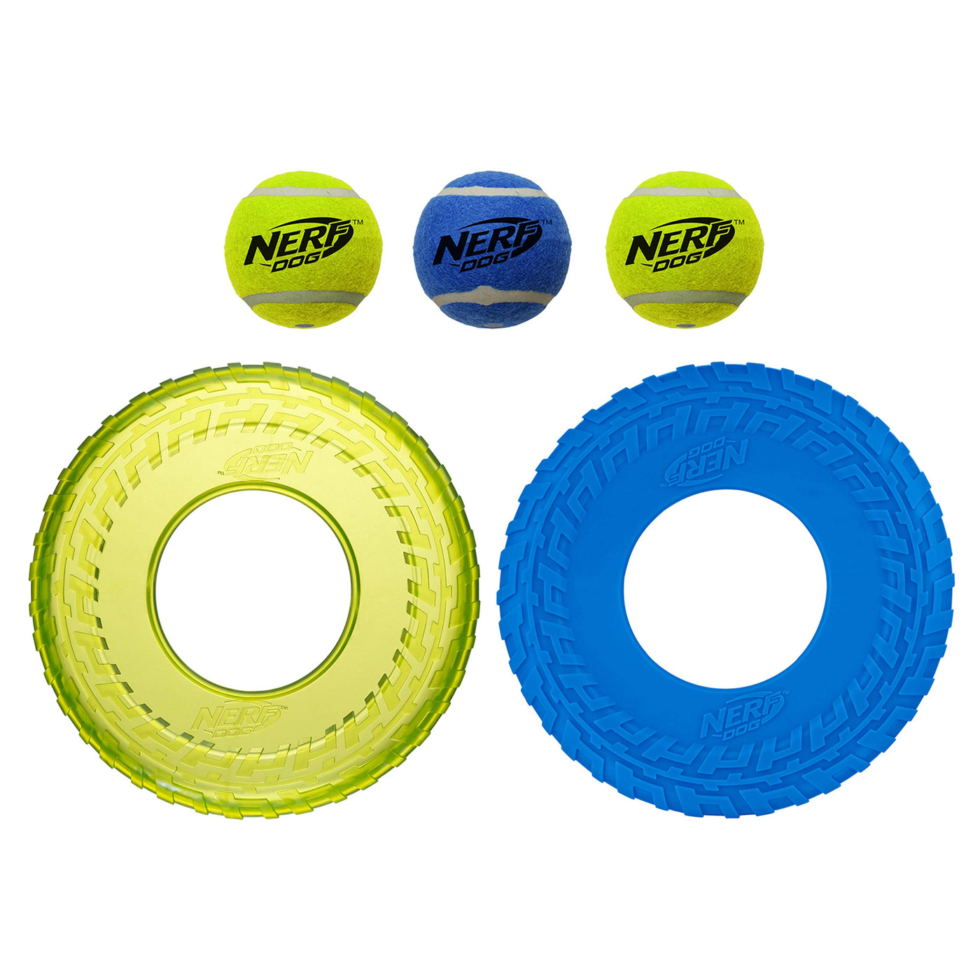 Nerf Dog 5-Piece Dog Toy Gift Set, Includes 2.5In Squeak Tennis Ball 3-Pack, 10In Translucent Tpr Tire Flyer, And 10In Tpr Tire Flyer, Nerf Tough Material, Green And Blue