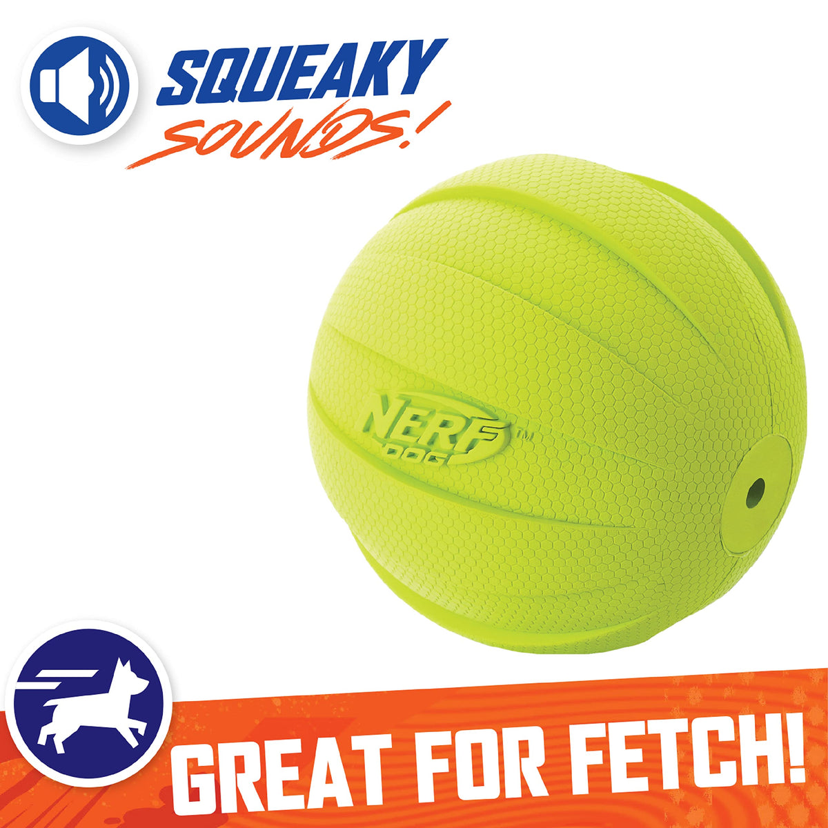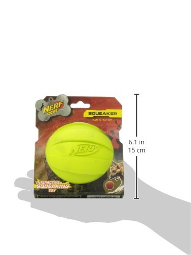Product DescriptionIf your dog loves squeakers, this is the ball for you!This durable rubber ball stands up to rough play and features a loud squeaker that will turn up the fun!The textured hexagon rubber outside makes gripping the ball easy a breeze--even when it's covered in dog drool! Designed for fetch, the ridged edges make this ball easy for your dog to pick up.Perfect for large dogs, this ball is 4 inches in diameter.From the ManufacturerThe Nerf Dog Squeaker ball is made to last, even with constant use. This rubber ball dog toy is highly durable, able to stand up to throwing, landing, bouncing, chewing and more. So get in the game and have some fun with your furry friend! 6 inch diameter. Available in two colors.