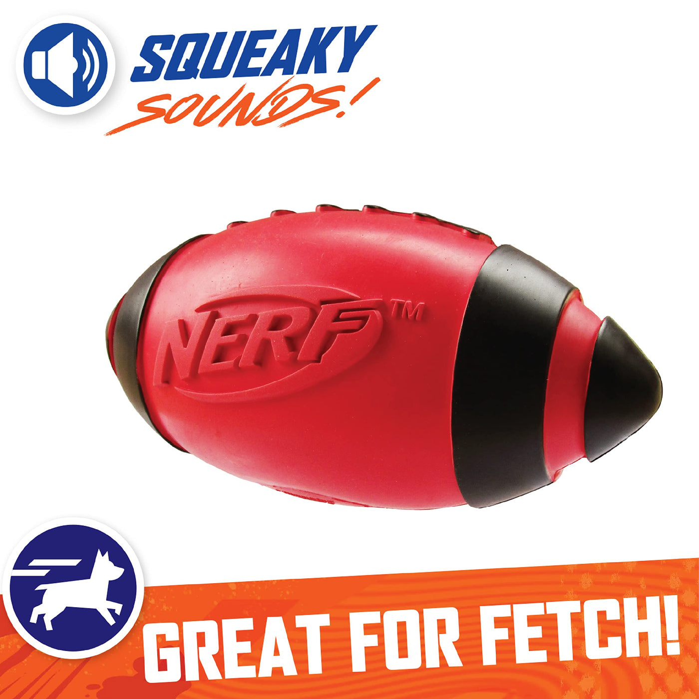 Product Descriptiondown. Set. Hut!!!Its Game Day Every Day With The Nerf Dog Squeak Football.Perfect For A Pick-Up Game In The Backyard With Your Favorite Mutt, This Football Is Constructed From Extra Strength Interactive Rubber And Features A Gripped Design To Make It Easy For Humans To Toss And Dogs To Catch.One Squeeze Is All You Need To Hear That Squeaker Sound That Dogs Love!The Nerf-Quality Materials Make This Dog Toy Lightweight And Durable So Its Great For Indoors And Outdoors.Its Made Of Water-Resistant, 100% Non-Toxic Rubber So It'S Safe For Pets And Its The Perfect Toy You Can Take To The Park, Beach Or Lake, Too. When It Gets Dirty From Outdoor Play, Simply Rinse Or Wipe Off And It'S Good To Go!From The Manufacturerdogs Will Love To Squeak And Shake Their Brand New Nerf Dog Squeaker Football! This High Performance Dog Toy Is Designed For Demanding Use By Both You And Your Pet. It Features A High Bounce, High Buoyancy, High Visibility And High Durability. The Nerf Dog Squeaker Football Features A Durable Rubber Exterior. This Interactive Toy Is 6 Inches Long And Great For Most Dogs And Puppies. Available In 2 Colors.