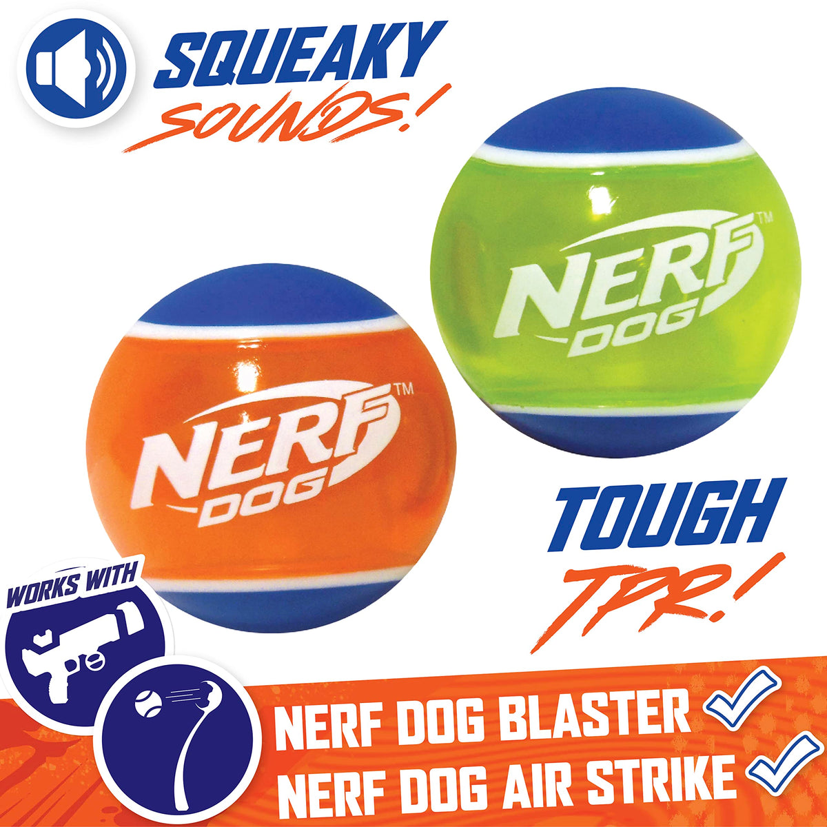 Q: Do these tennis balls have squeakers for added fun?A: Absolutely! Each Nerf Dog Tennis Ball features an interactive squeaker that engages your dog during play, making fetch and training sessions more enjoyable.