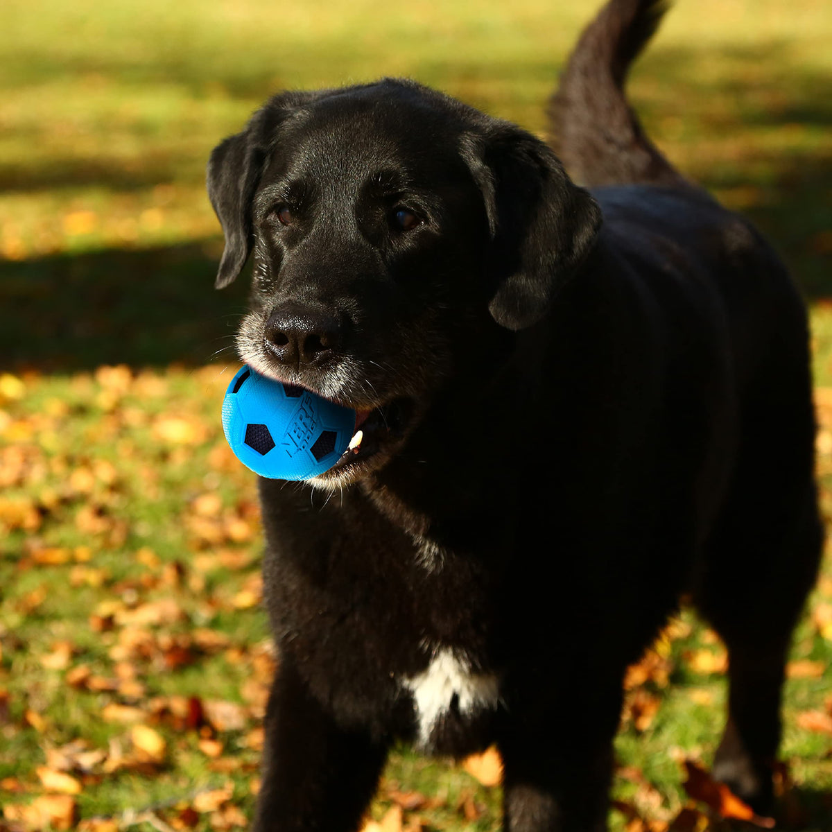 The Nerf Dog medium Crunchable Soccer Squeak Ball will entertain your dog for hours on end! The durable body stands up to extended chewing and makes squeaking and crunching sounds that dogs love. Plus it has a textured hexagon pattern that makes it easier to grip for both of you! Great for toss and fetch or solo play sessions. Sturdy rubber and nylon.