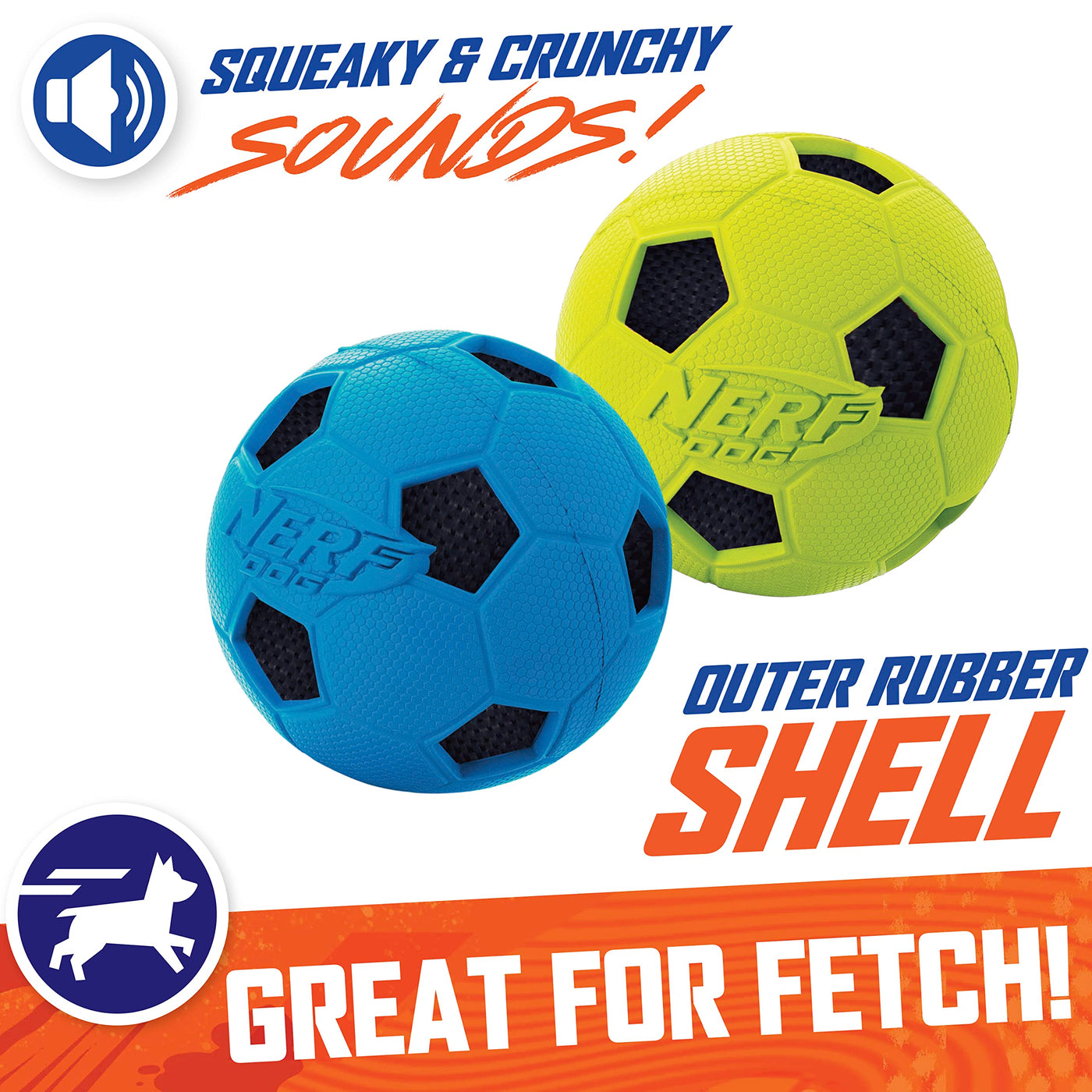 Nerf Dog Soccer Ball Dog Toy With Interactive Crunch, Lightweight, Durable And Water Resistant, 3 Inches, For Small/Medium/Large Breeds, Two Pack, Blue And Green