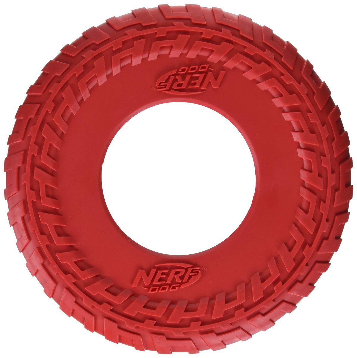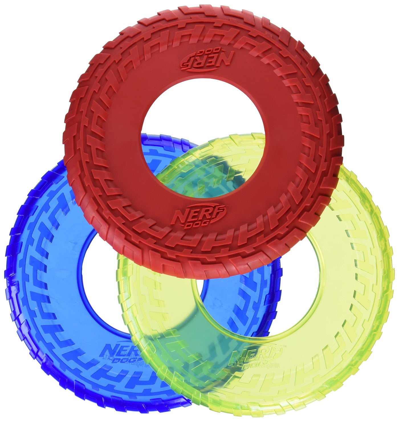 Nerf Dog Tire Flyer Dog Toy Gift Set, 10 Inch Flying Disc Dog Fetch Toys, Rubber Dog Toy For Medium Dogs And Large Dogs, Red, Translucent Green And Translucent Blue, 3 Count