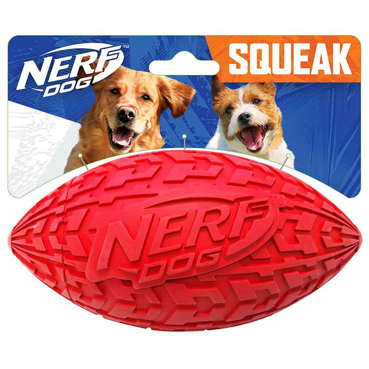 The Nerf Dog Medium tire squeak football provides as much fun for dogs as it does for their owners! The durable rubber body stands up to extended chewing and makes an interactive squeaking sound that dogs love. Plus it has an ultra-grip tire tread texture that makes it easier to grip for both of you! Great for toss and fetch, or solo play sessions.