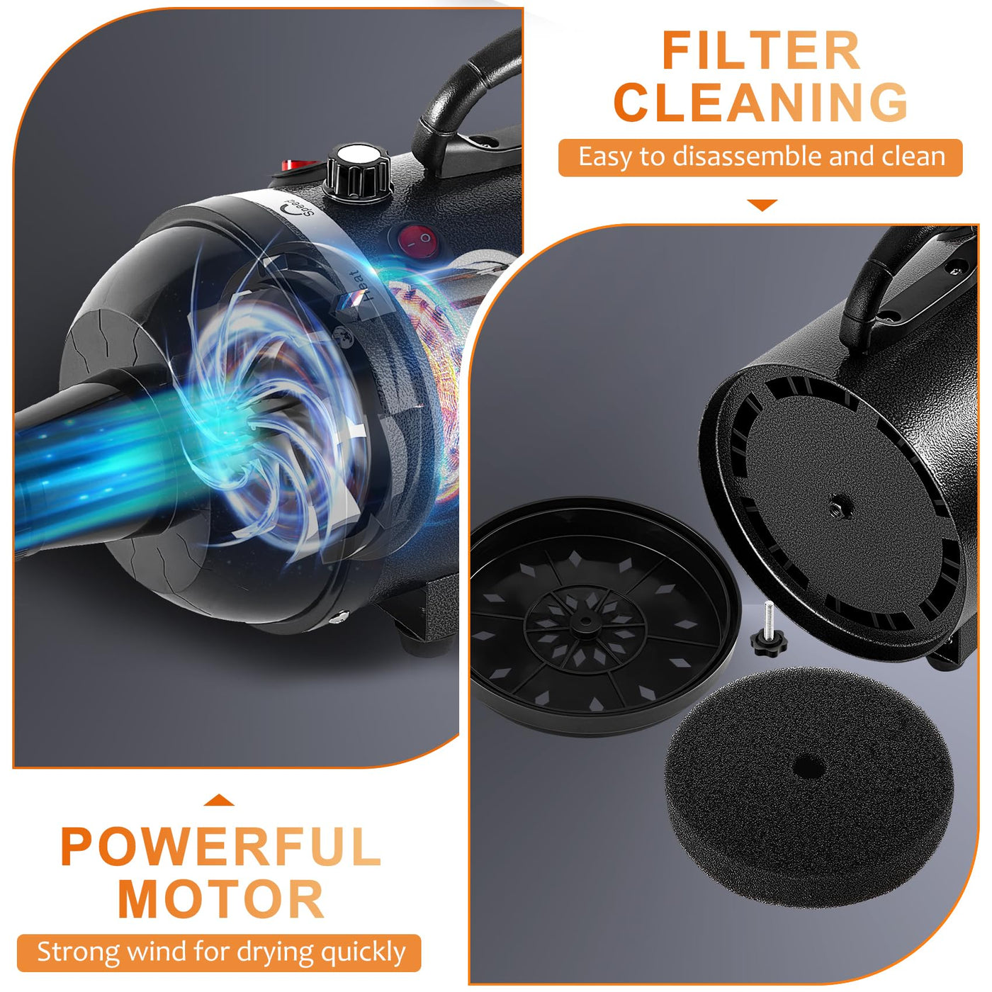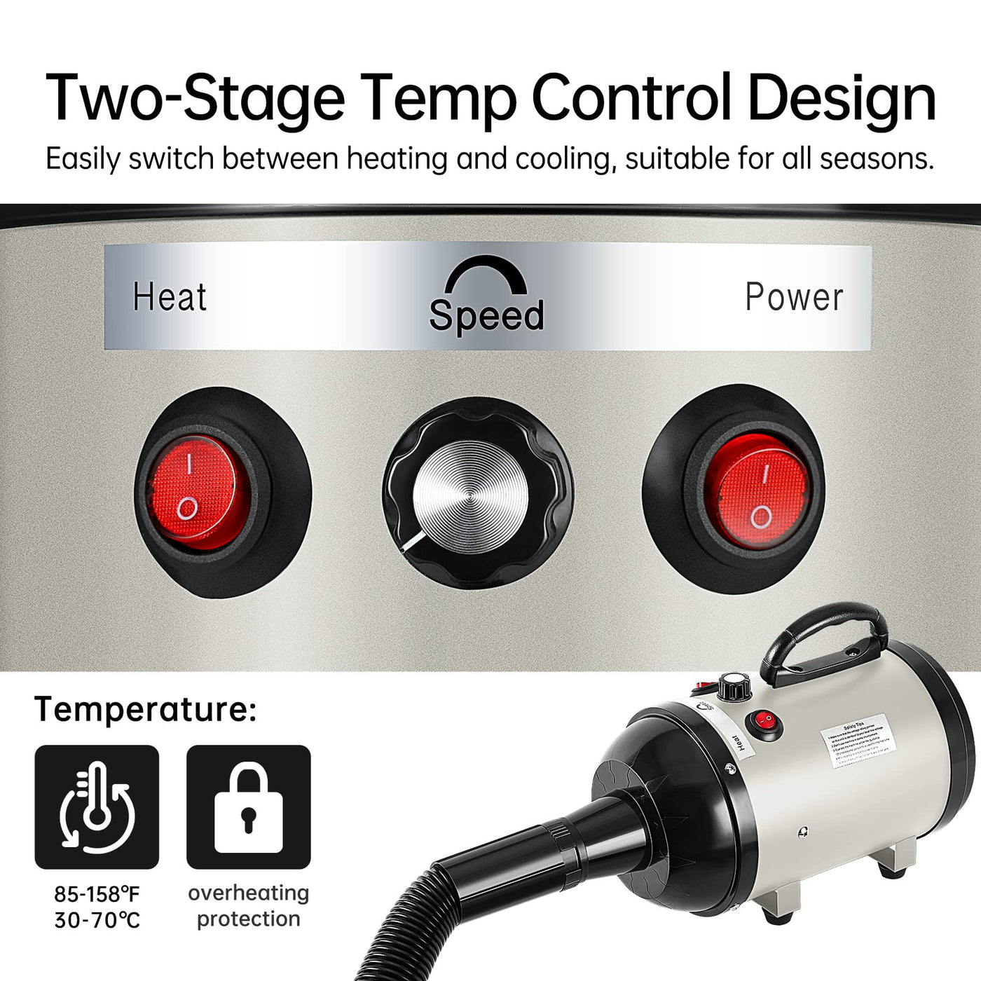 High Velocity Professional Pet DryerThis pet hair dryer equipped with a powerful and stable motor featured stepless speed regulationwhich allow you choose the different wind lever for pet size to dry your pets hair in the shortest time Quick-DryingThe dog blower dryer can adjust the temperature for cold or warm perfect for all seasons always work at a suitable temperature to avoid pets from being injured for quickly drying Reduce Noise & Heat InsulationThe professional pet hair dryer adopts low noise technology to avoid the stress caused by the pets excessive sound when drying the pets hairInsulated Metal casing to insulate the heat which isolates the motor and the circuit reduces the failure rate of the hair dryer 4 Nozzles & Flexible HoseESTROAD dog grooming dryer comes with 4 pro-quality styling nozzles which could be used for all breeds of dogs even tiny cats The flexible hose could be expanded to 8ft which can ensure that your movements are more unrestricted and free when you dry your pet ackage List & Thoughtful ServiceYou will get:1 x Dog Dryer 4 x Nozzles 1 x Flexible Hose 1 x Brush 1 x User ManualIf you have any questions about this dryer please feel free to contact us at any time