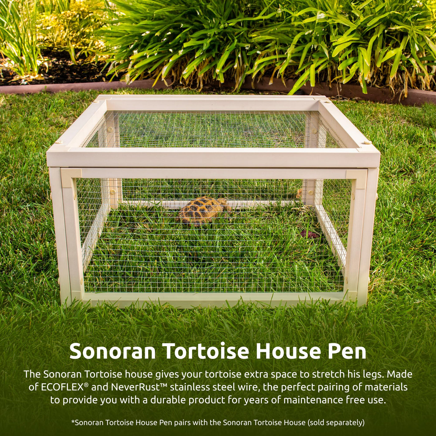 The Sonoran Tortoise Pen is the perfect accessory for the Sonoran tortoise house. This pen gives your tortoise extra room to roam and bask in the sun, while keeping them secure. Made of ECOFLEX and NeveRust stainless steel wire. ECOFLEX is a proprietary composite blend of recycled polymers and reclaimed wood fiber byproducts. The perfect pairing of materials to provide you with a durable product for years of maintenance free use. Plus. ??? ??? ?? ??? ??? ?? ?? ??? ???????. ? ?? ???? ?? ?? ???? ?????? ??? ???? ??? ? ????. ECOFLEX ? NeveRust ????? ?? ???? ???????. ECOFLEX? ??? ???? ?? ?? ?? ???? ???? ?? ??????. ???? ?? ??? ?? ?? ??? ?? ??? ?? ??? ???? ??? ??? ???. ??, ? ?? ?? ??? ???? 10? ?? ???? ??? ?????.