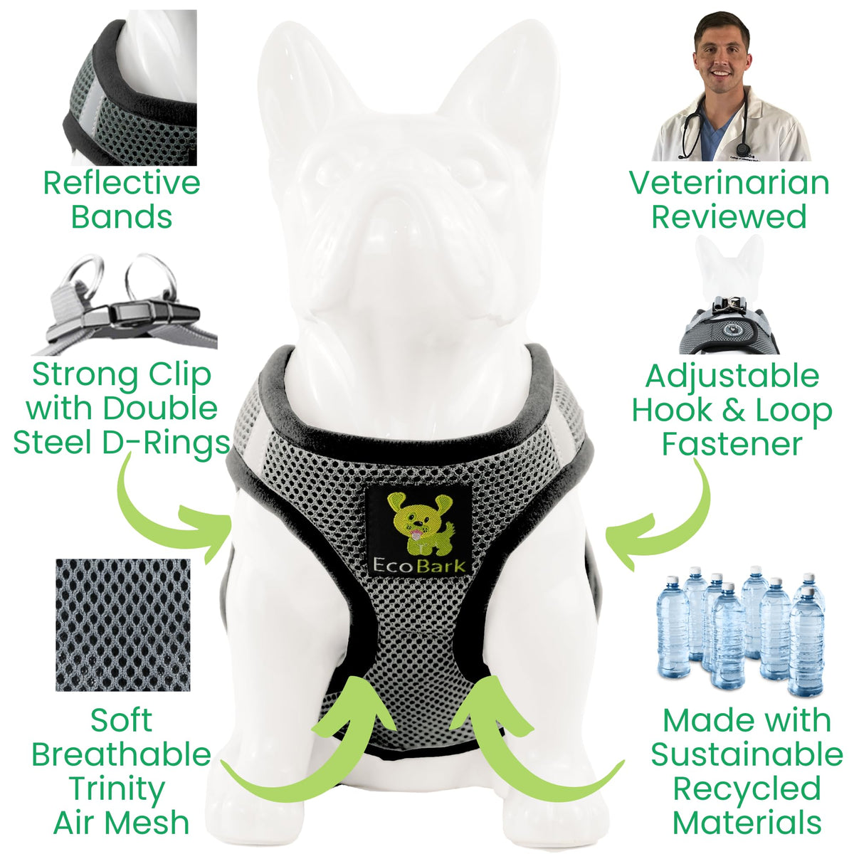 Q: How does the EcoBark harness ensure my dog's safety during walks?A: The EcoBark harness features an innovative no-choke design that protects your pet's fragile trachea and throat. The ultra-padded mesh and plush piping around the neck opening ensure comfort and safety during walks, running, and outdoor activities.