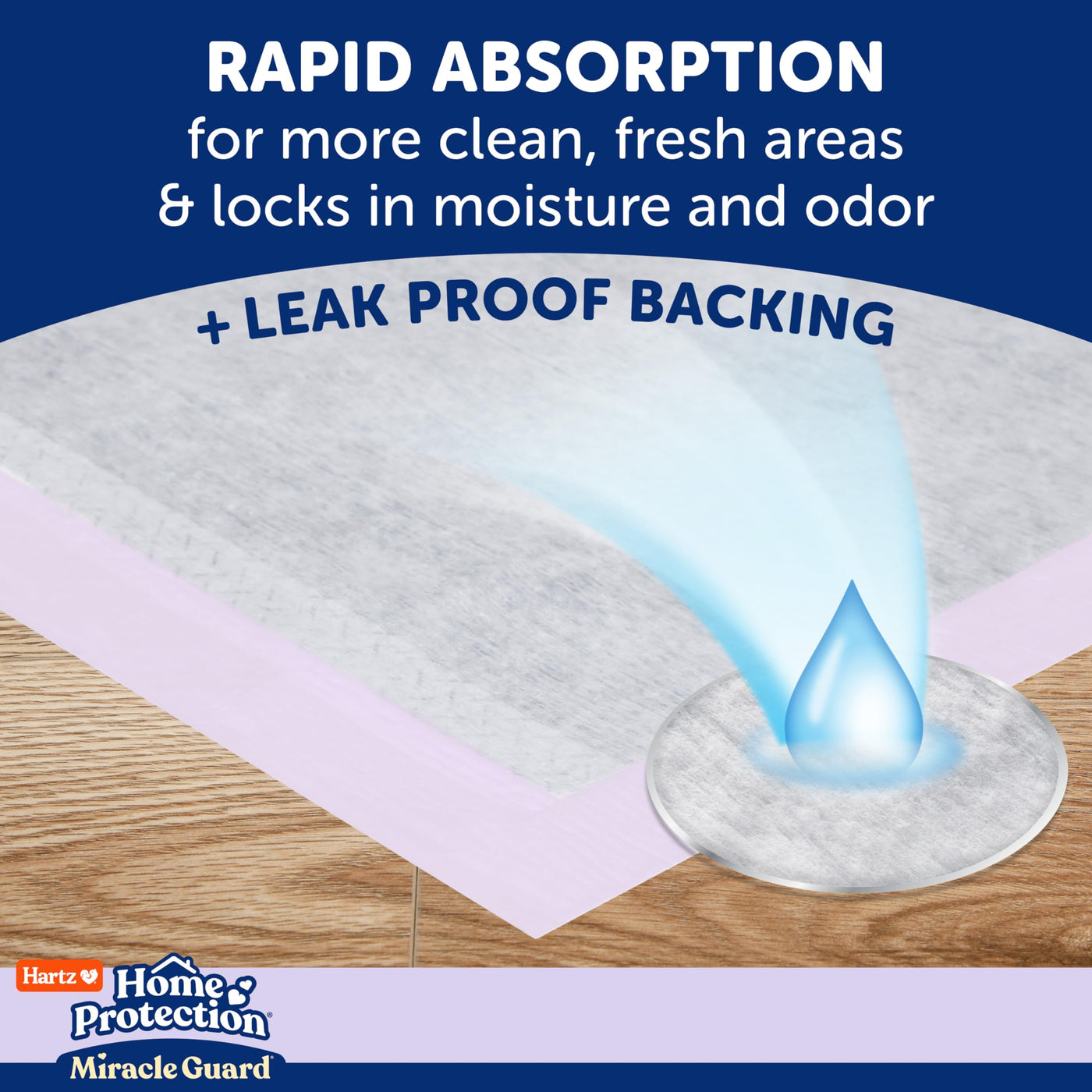 Introducing the latest advancement in dog pad technology: Hartz Home Protection Miracle Guard Lavender Scented Dog Pads are designed for up to 3X longer use than leading competitors, so you can confidently leave your dog pads down for an extended period of time without compromising a clean home. This pad is built with 3X more absorbency and features a spot-concealing, quick-drying top sheet to provide more clean, fresh areas with no leaks or odors. Now you can use fewer pads while keeping your home looking and smelling cleaner longer. Now available with a fresh lavender scent to keep your home smelling clean!