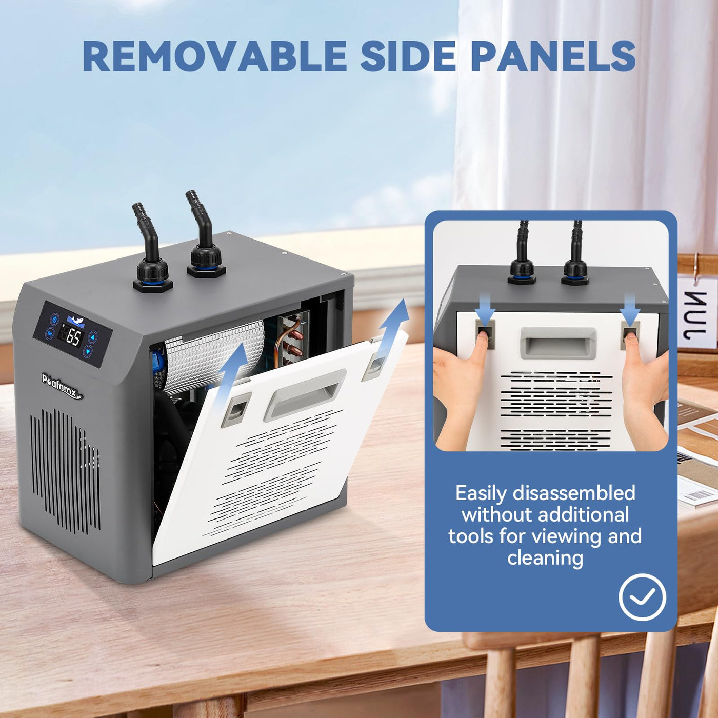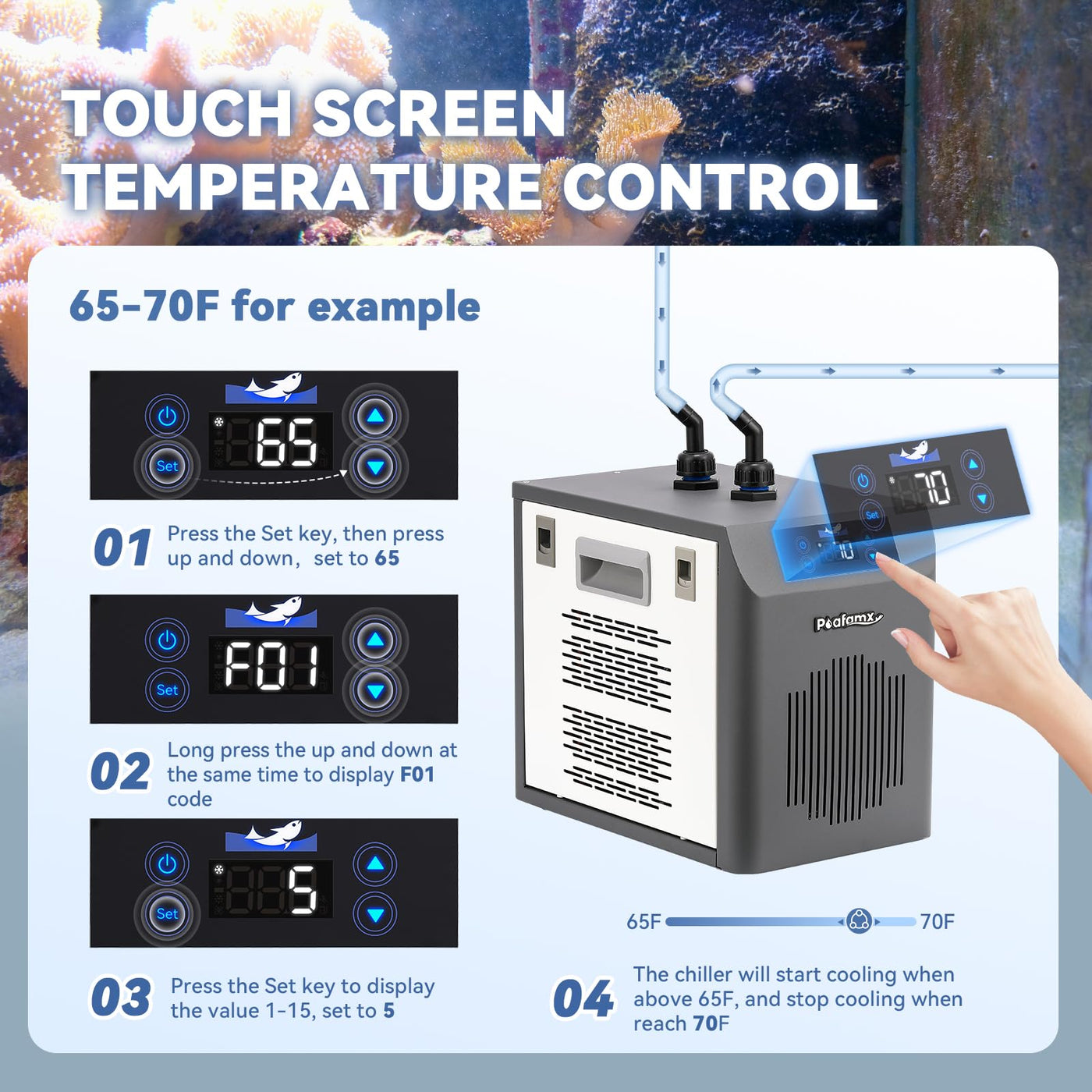 Poafamx New Upgraded 42 Gallon Aquarium Chiller, a top-notch cooling solution for your aquatic life. Featuring an intuitive touchscreen control, you can precisely set and monitor the water temperature with ease. The removable side panel grants easy access for maintenance, while the high-efficiency compressor ensures rapid and consistent cooling. Plus, its low-noise operation and excellent heat dissipation make it a perfect fit for any peaceful aquarium environment. Poafamx 1/10 HP Water Chiller offers a comprehensive and user-friendly solution for keeping your aquarium at the perfect temperature. With its advanced features and reliable performance, its an essential addition to any aquarium setup.