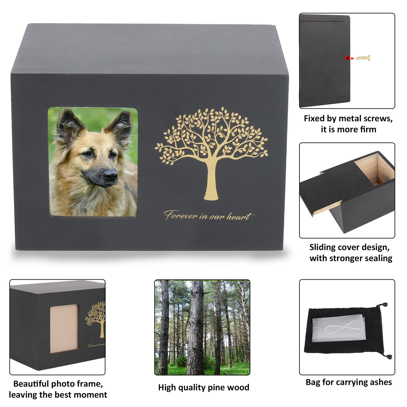 Q: What materials is the dog urn made from?A: The dog urn is made from high-quality wood, which is corrosion-resistant and wear-resistant, ensuring durability. Each urn has a unique wood grain and a smooth transparent coating for a beautiful finish.