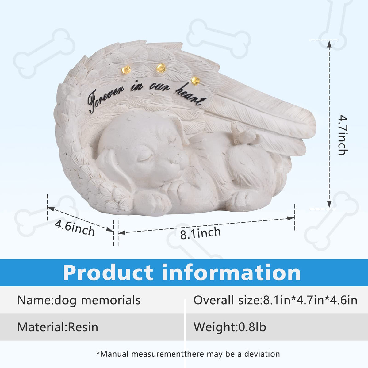 An angel memorial dog with wings, the size of the dog is4.1 '(H) x4.7' (W) x 8.1 '(L).This is a pet souvenir.can be kept at home and outdoors. The dog memorial hall is made of resin. Made of cohesive crushed stone, this statue’s tribute at home is a popular healing gift. This meticulously crafted keepsake sculpture grave is a beautiful tribute to the beloved pet and a loving memorial to the beloved dog。