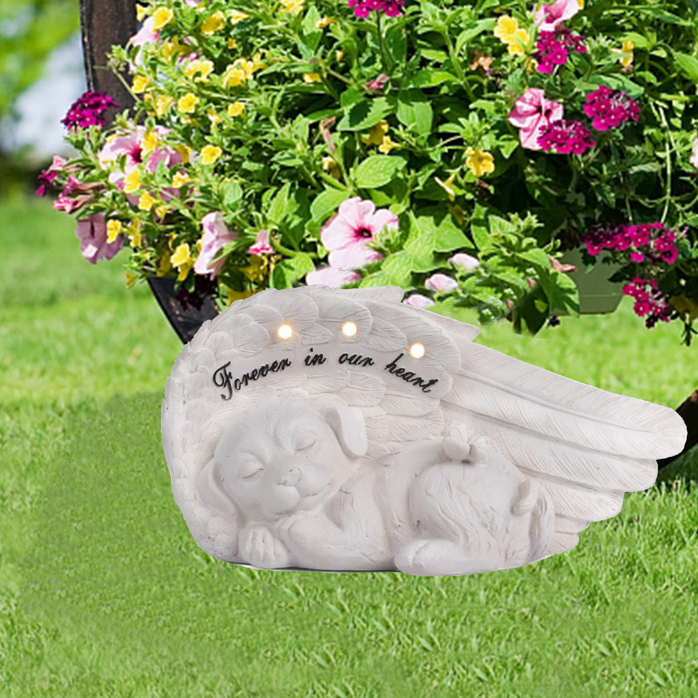 Q: Is the dog memorial statue suitable for both indoor and outdoor use?A: Yes, the NEWDREAM Solar Dog Pet Memorial Statue can be displayed both indoors and outdoors, making it a versatile memorial piece for honoring your beloved pet.