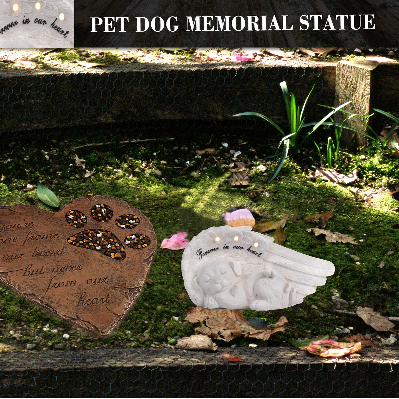 Q: What materials is the NEWDREAM Solar Dog Pet Memorial Statue made of?A: The NEWDREAM Solar Dog Pet Memorial Statue is crafted from durable resin and cohesive crushed stone, ensuring it is both weather-resistant and suitable for outdoor use.