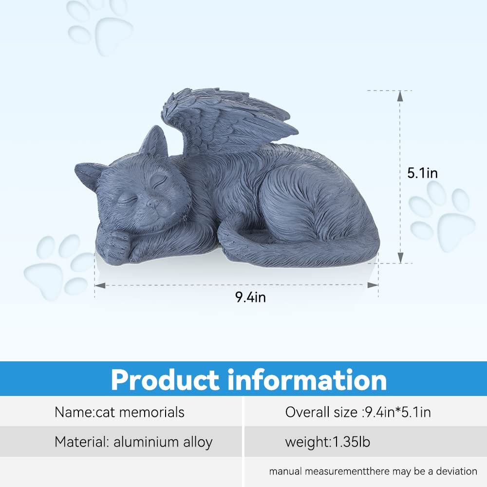 Q: What are the dimensions of the Cat Angel Memorial Statue?A: The statue measures 5.1 inches in height, 5.4 inches in width, and 9.4 inches in length, making it a perfect size for both indoor and outdoor displays.