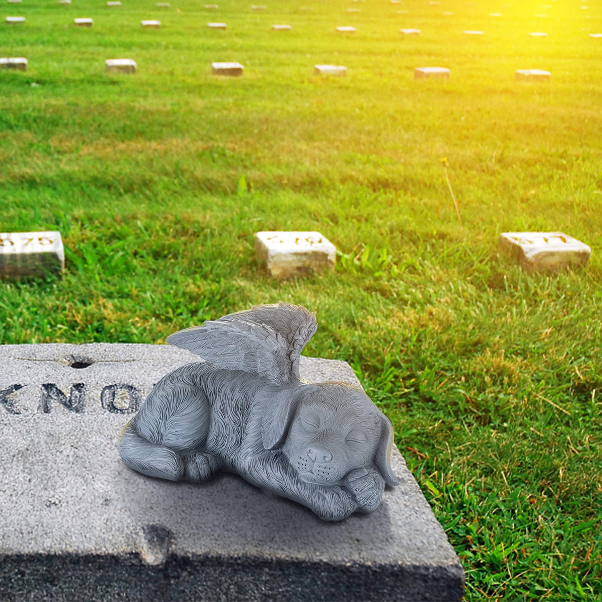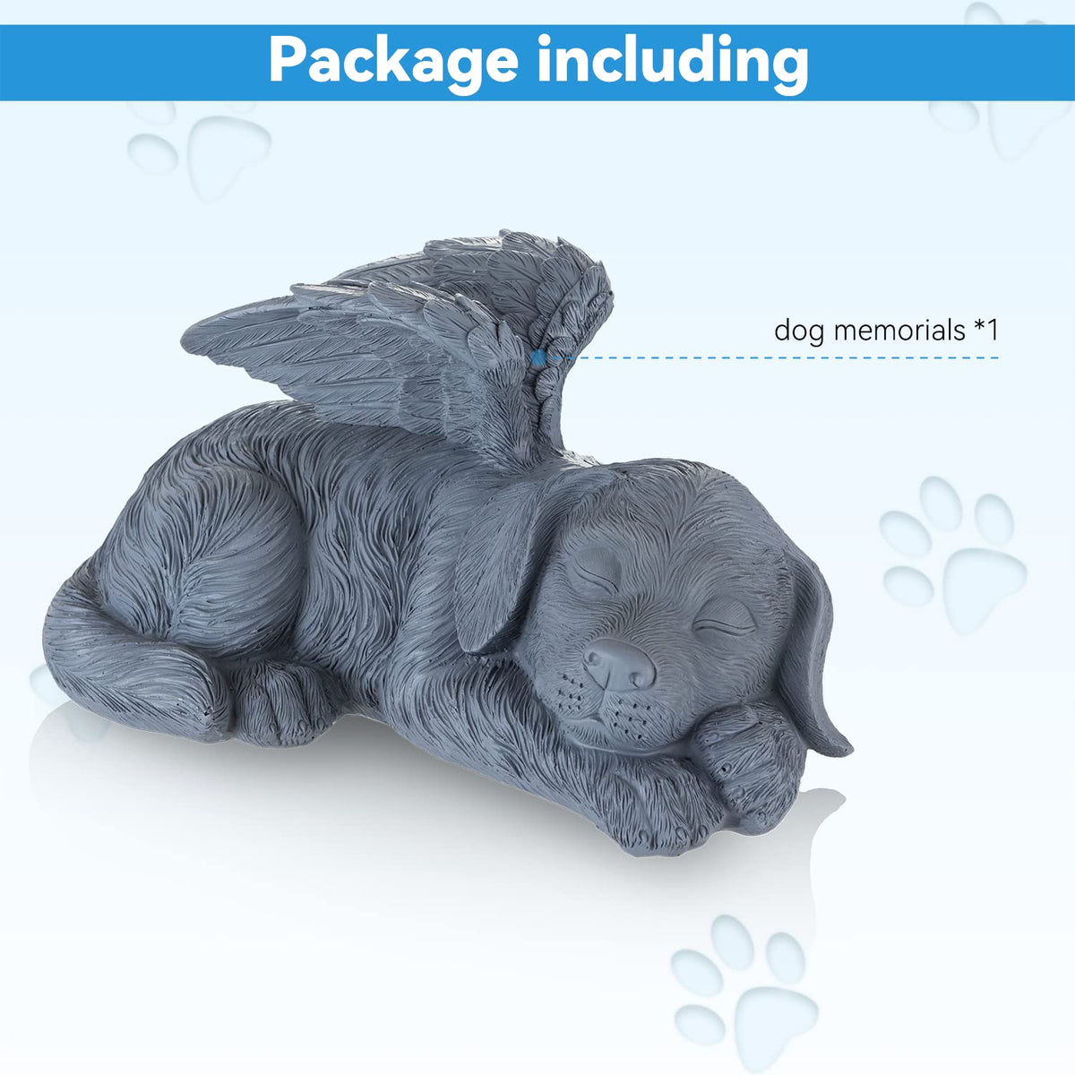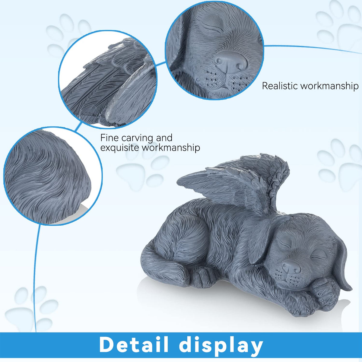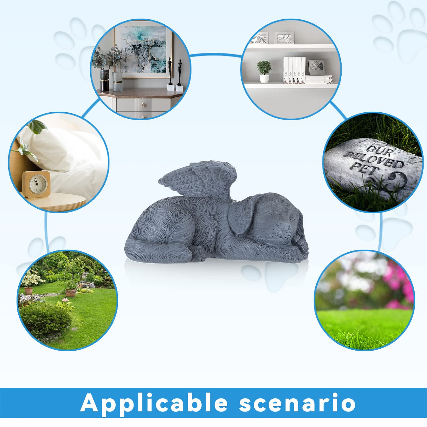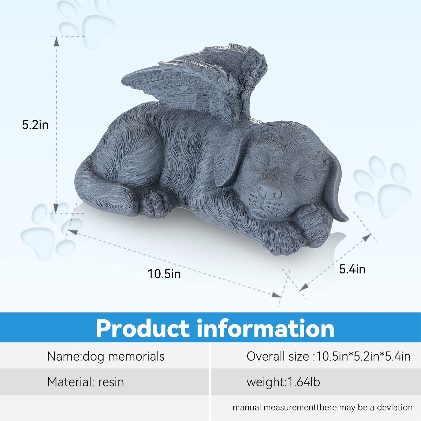 An angel memorial dog with wings, the size of the dog is 2.3 '(H) x 2.1' (W) x 4.7 '(L).. This is a pet souvenir. It is small and can be kept at home and outdoors. The dog memorial hall is made of resin. Made of cohesive crushed stone, this statue’s tribute at home is a popular healing gift. This meticulously crafted keepsake sculpture grave is a beautiful tribute to the beloved pet and a loving memorial to the beloved dog