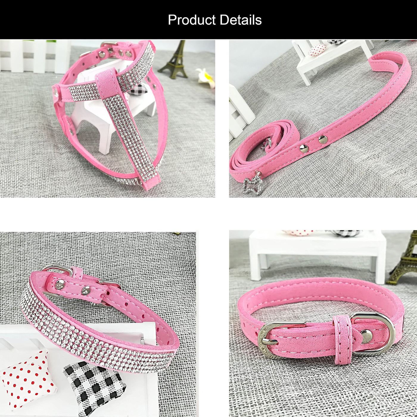 Product Description: Item: Newtensina Dog Collar & Harness & Lead Sets Fashion Dog Collar Diamante With Harness & Leashes Comfortable Soft Collar Harness And Leashes Set For Dog High Quality Material: Microfiber & Diamante 3 Pieces Dog Collar & Harness & Leashes Set Design, With Beautiful Diamante, Fashion And Cool, Keep Your Honey Pets More Charming, Highly Recommended! Standard Size: Xs: Neck Size(Collar Adjustable Size): 19-25Cm, Chest Size(Harness Adjustable Size): 28-35Cm; Leash Size: 120*1.5Cm; S: Neck Size(Collar Adjustable Size): 25-31Cm, Chest Size(Harness Adjustable Size): 28-35Cm; Leash Size: 120*1.5Cm; M: Neck Size(Collar Adjustable Size): 31-37Cm, Chest Size(Harness Adjustable Size): 34-44Cm; Leash Size: 120*1.5Cm; L: Neck Size(Collar Adjustable Size): 31-37Cm, Chest Size(Harness Adjustable Size): 45-55Cm; Leash Size: 120*2Cm; Tips:Before Ordering, Please Measure Your Pets Neck Size And Chest Size And Make Sure The Size That You Choose Should Meet:The Neck Size And Chest Size Are Both At Least 2Cm Larger Than Your Pet. (Please Note This: The Harness In Xs Size And S Size Is The Same Size And The Collar In M Size And L Size Is The Same Size.) Notice: 1.Please Double Check Our Size And Consider Your Pets Measurement Before Ordering. 2.This Is Our Standard Size Of The Collar & Harness, For More Comfortable Fitting Of Your Pets, We Recommend You To Select The Size That Is 2-3Cm Larger Than Your Pets Measurements. 3.When You Receive The Goods, You Will Also Get 4Pcs Little Clips. These Clips Are Used For Fixing The D Ring, You Can Fix The Clips In Your Need Hole To Fix The D Ring Position According To Your Need. 4.Due To Manual Measurement, The Existence Of 1-2Cm Error Is A Reasonable Range. 5.Color May Be Little Different Due To Monitor. Package: 1 X Collar + 1 X Harness + 1 X Leashes