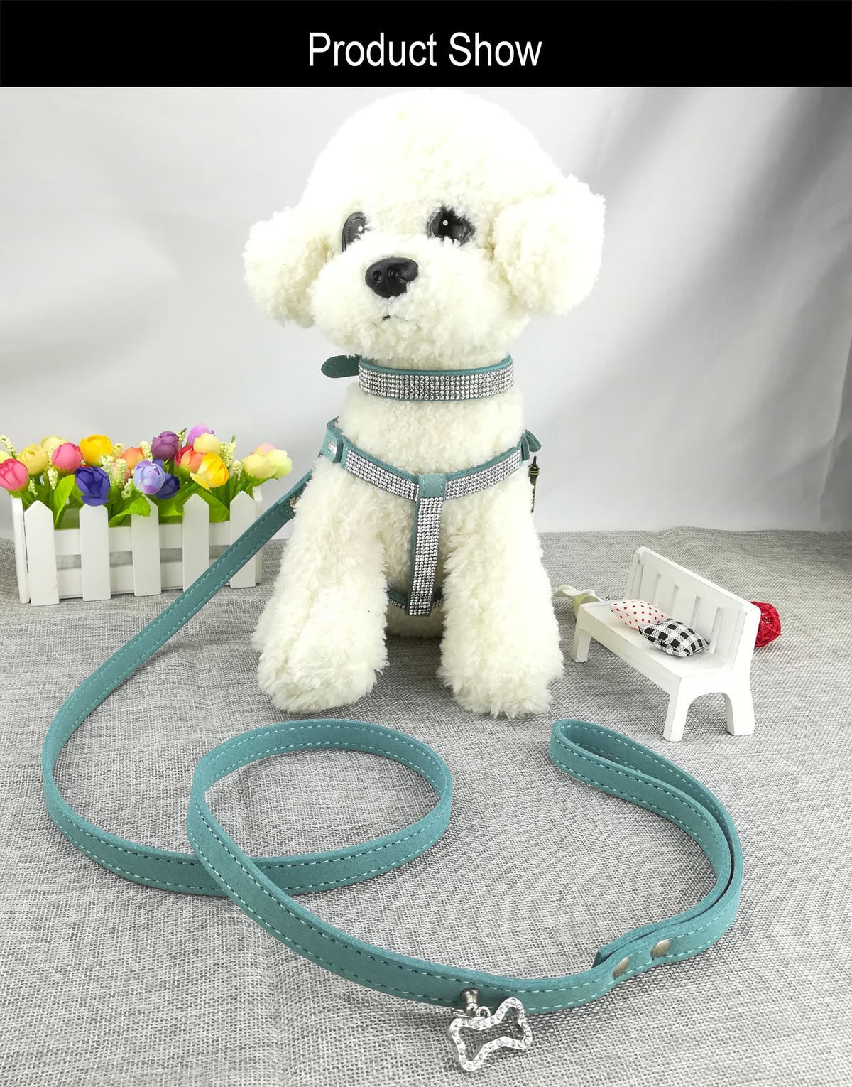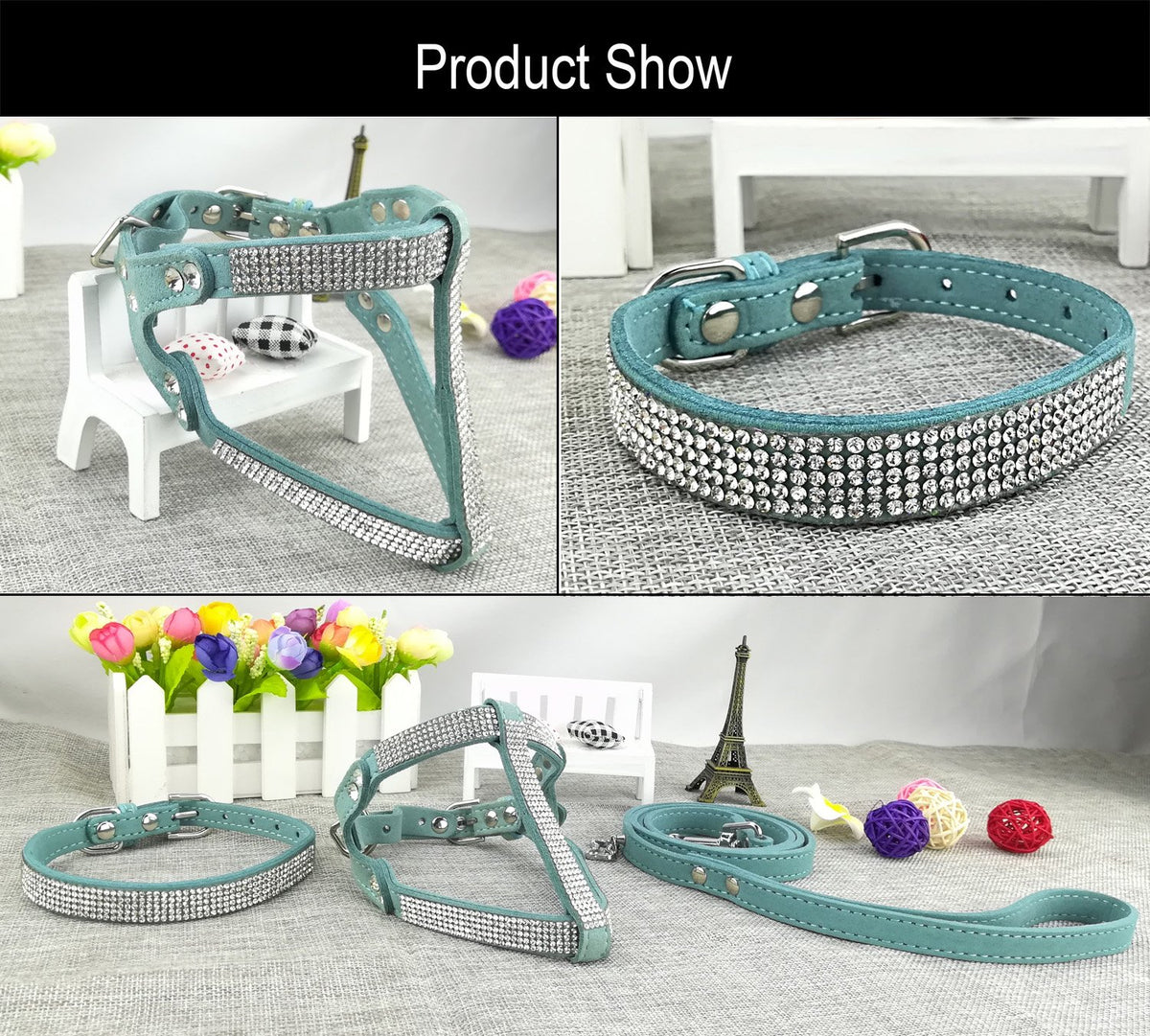 Product Description: Item: Newtensina Dog Collar & Harness & Lead Sets Fashion Dog Collar Diamante with Harness & Leashes Comfortable Soft Collar Harness and Leashes Set for Dog High Quality Material: Microfiber & diamante 3 Pieces Dog Collar & Harness & Leashes Set Design, with beautiful diamante, fashion and cool, keep your honey pets more charming, highly recommended!