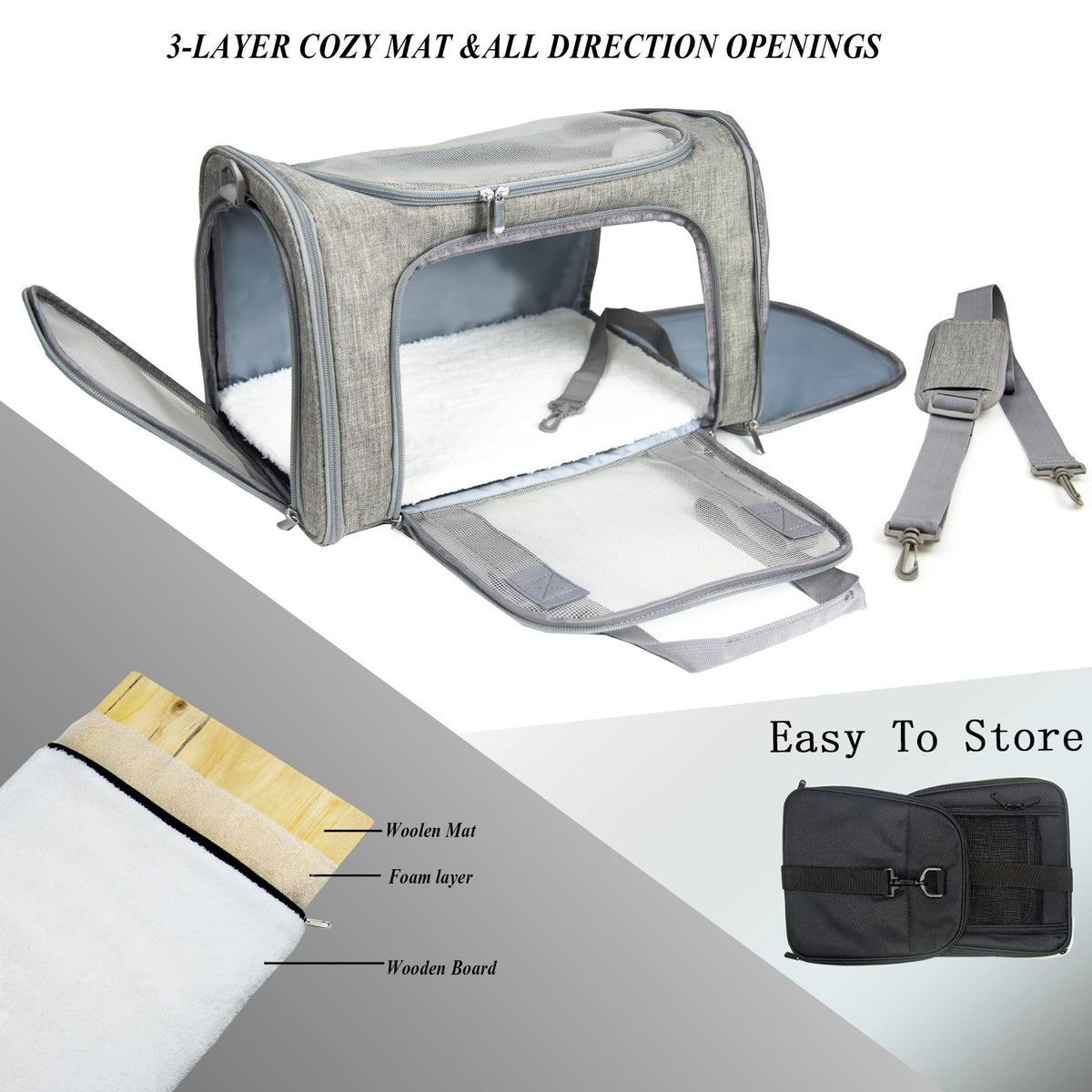 Airline Approved Carrier:With Airline-Approved Design, You Can Take Your Pet To Go To Everywhere. This Pet?Carrier?Provides Two Connecting Loop Handles For Balanced Carrying As A Dual Seat Belt?Or Luggage Strap To Secure Transport.?Do Not Take The Cat Carrier On The Southwest Airlines Or Alaska Airlines: Our Pet Carrier Is 10.5 Inches High(Medium Size), Which Is Out Of The Airlines Maximum Height (8.5 Inches)Convenient & Safe:Put The Package On Your Suitcase Directly, And Your Pet Can Move Forward With You Synchronously. This Design Can Lighten The Burden For You And Make Your Travel Relaxing. Portable & Washable:This Cat?Carrier Is Easy To Carry And Store, Which?Has A Padded Shoulder Strap And Handles. The Cozy Fleece Pet Bed Can Be Completely Removed And Machine-Washed. Washing Notes:1. Promptly Wipe Up Any Matter Or Liquid With A Damp Cloth Or Sponge.2.?Machine Wash On Gentle Cycle In Cold Water With Suitable Detergent.3. The Wood And Foam Rubber Are Not Machine Washable, And The Other Parts Are Machine Washable. Tips:1.Do Not Place The Large Pet Carrier Under An Airplane Seat: Only Suitable For Daily Travel, Car Seat Journey And Pet Hospital Etc.2.Do Not Take The Cat Carrier On The Southwest Airlines: Our Pet Carrier Is 11.0 Inches High(Medium Size), Which Is Out Of The Southwest Airlines Maximum Height (8.5 Inches)3.Better Available For Small And Medium Pets Within 15Lbs(Medium) / 23Lbs(Large). Please Measure Your Pet Size In Advance.4.A New Pet Carrier May Have A Smell, Please Wash It Or Place It In An Outdoor Ventilated Place For Hours Before First Use.Package Contains:1 X Pet Carrier