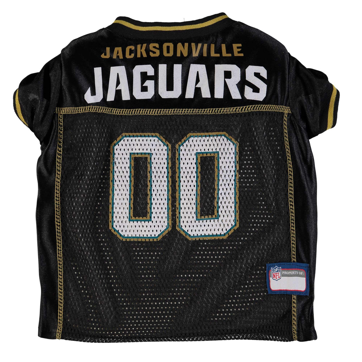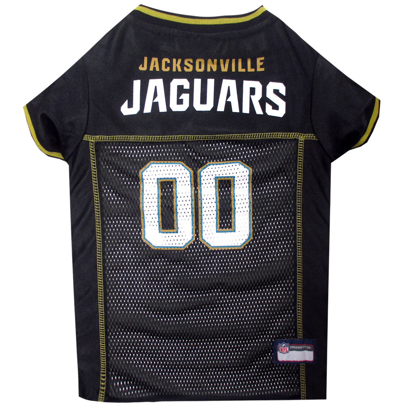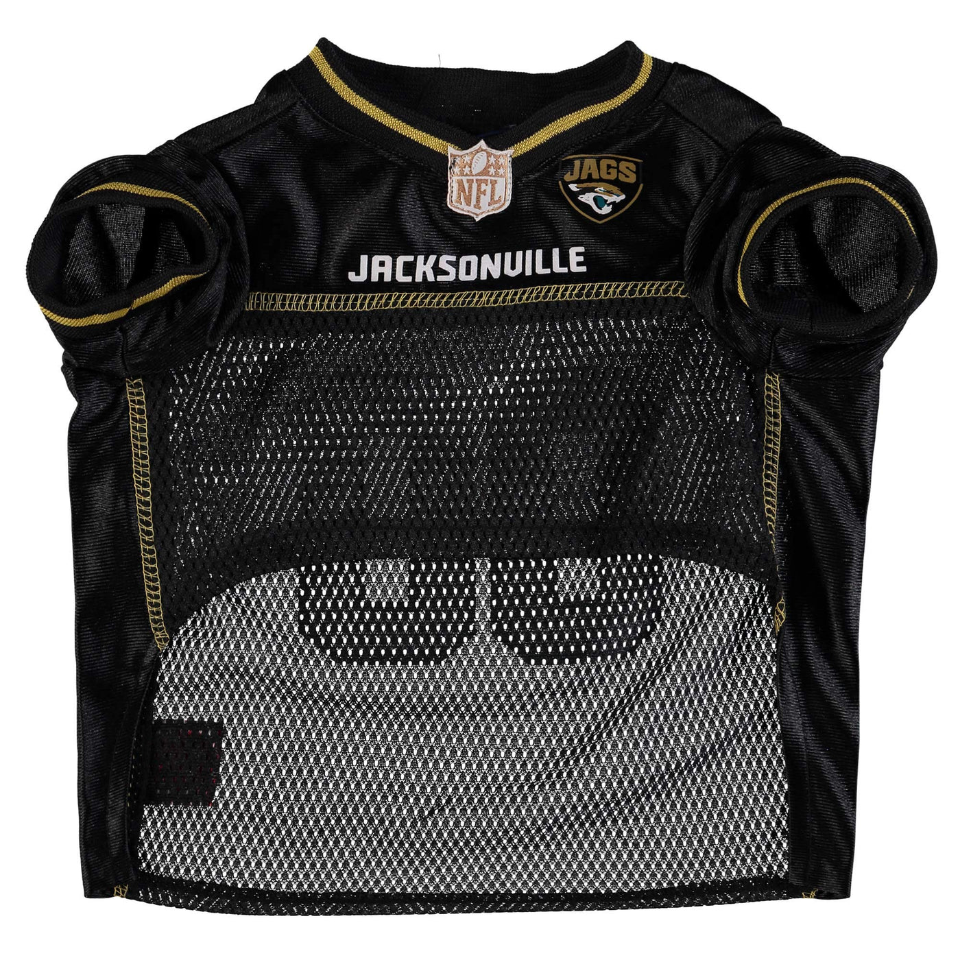 Q: What materials are used in the NFL Jacksonville Jaguars Dog Jersey?A: The jersey is made from a combination of durable poly-mesh and satin materials, ensuring maximum comfort, durability, and style for your pet.