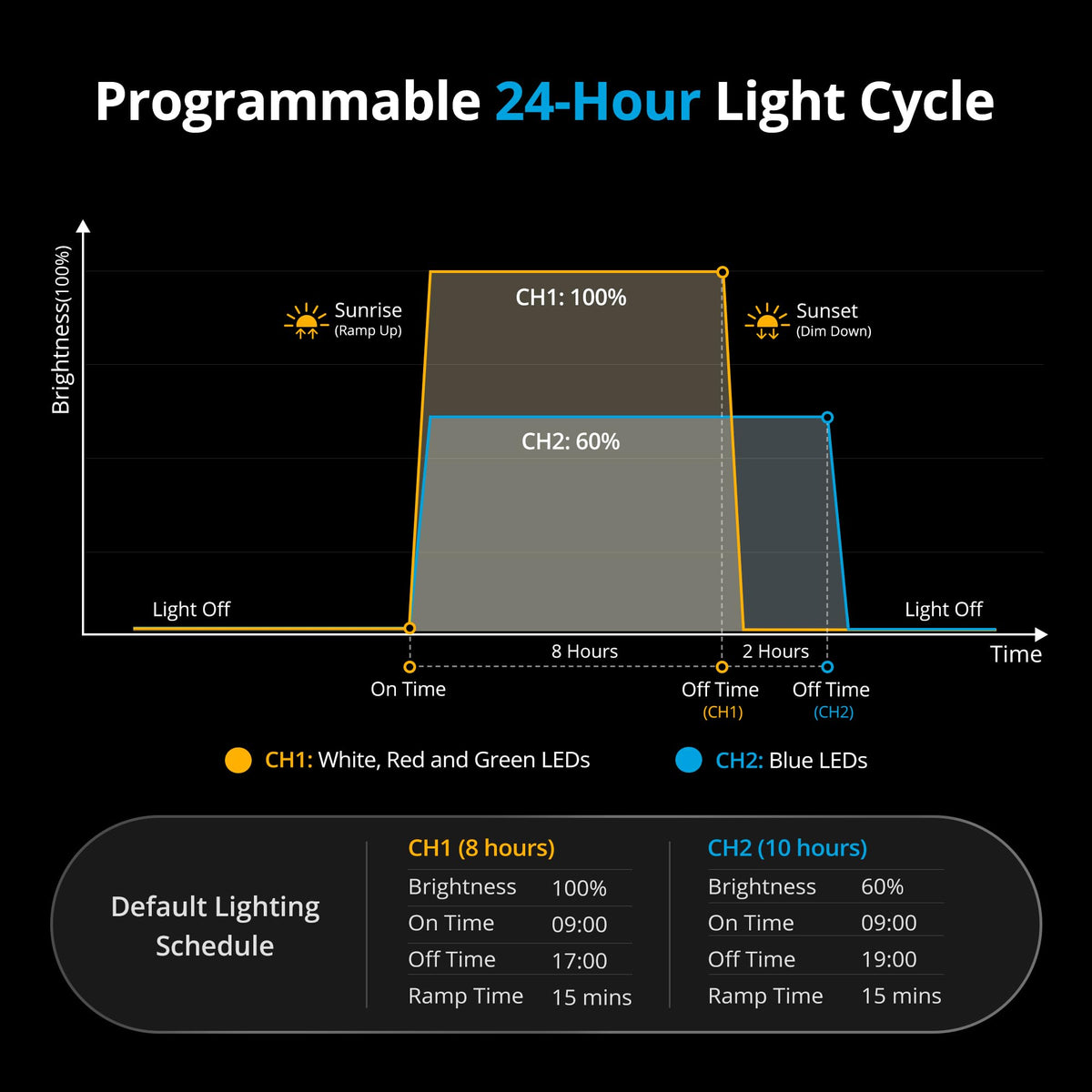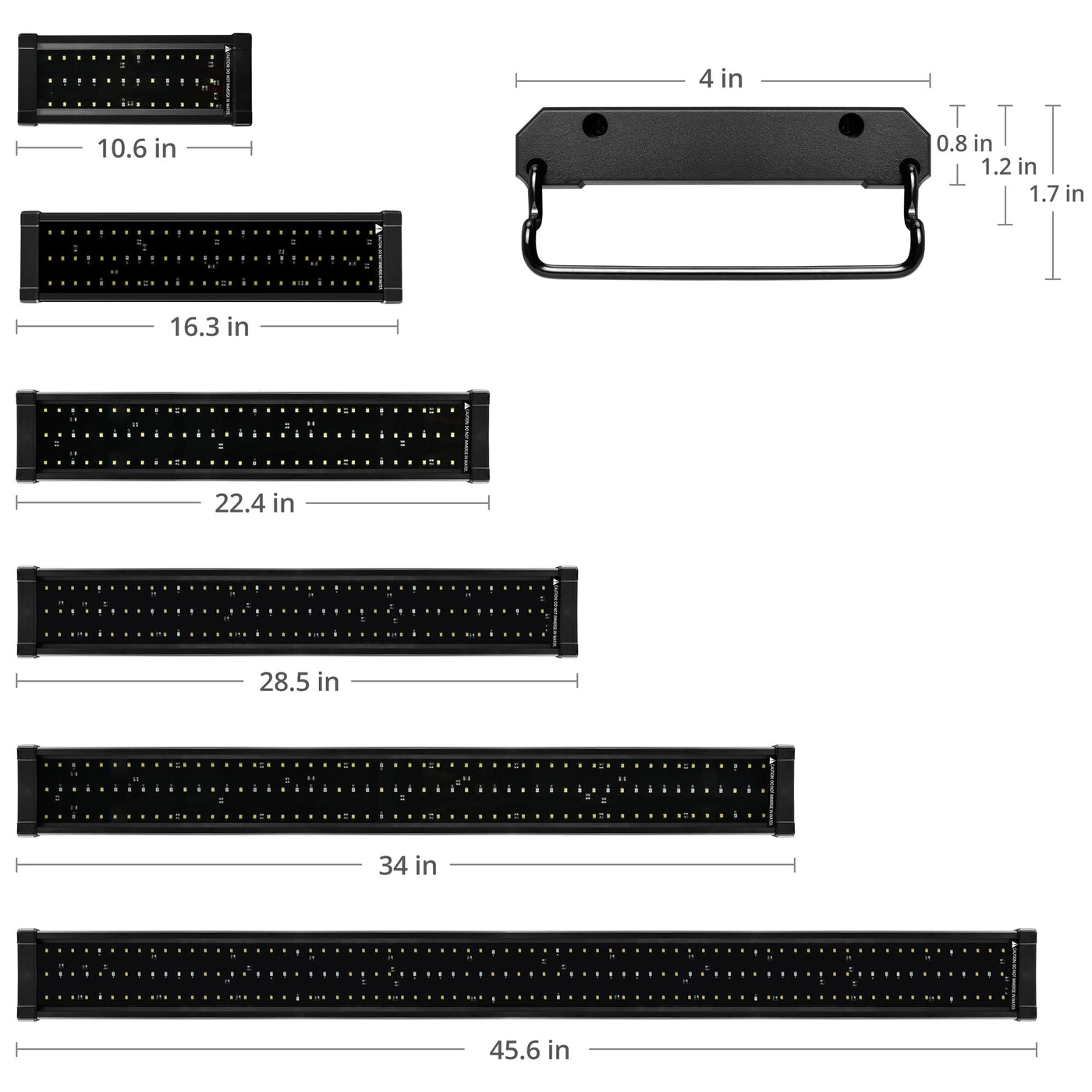 The full-spectrum light combines 6500K white, 450nm blue, TRUE 660nm deep red and green LEDs, producing a fine-tuned color spectrum. Adjustable spectrum on 2 lighting modes achieves more control flexibility. (Spectrum adjustable only when using timer, not for manual on) | Provides more options to adjust the auto On/Off time and brightness. Featured 15 or 30-minute ramp-up and dim-down to simulate natural sunrise and sunset, waking the fish up in soft lighting and ensuring a good sleep with complete off at night | Excellent color rendition with a high CRI of 91 for better appreciation of aquatic plants without distortion, restoring the most accurate natural colors of fish and aquatic plants. Suitable for freshwater or saltwater fish and low-medium light level plants | Adjustable docking mounts on both sides provide an easy way for quick adaptability to fit most rimless and framed aquariums | Aluminum alloy shell helps best heat dissipation, and this light is recommended for use over glass or acrylic canopy-covered aquariums