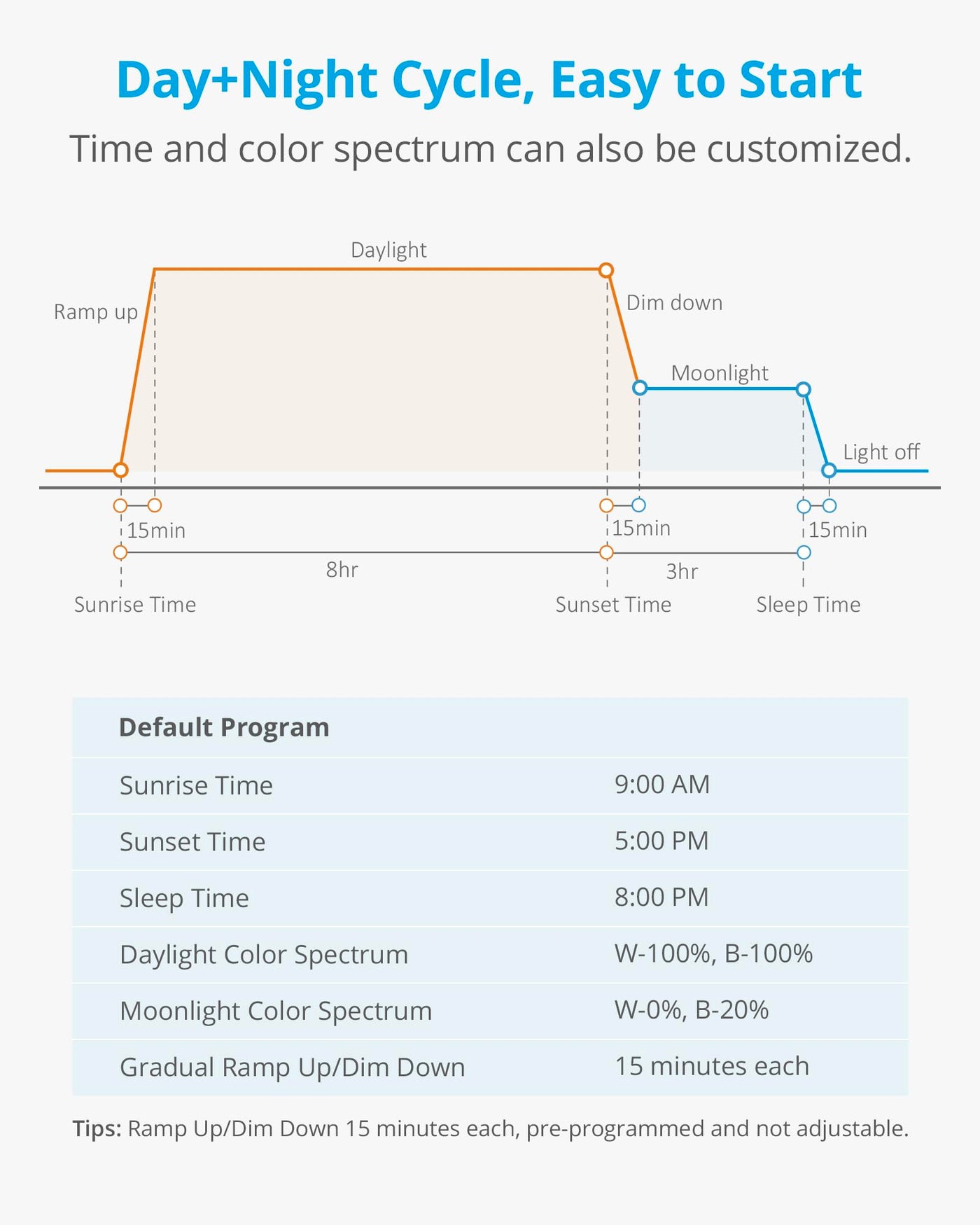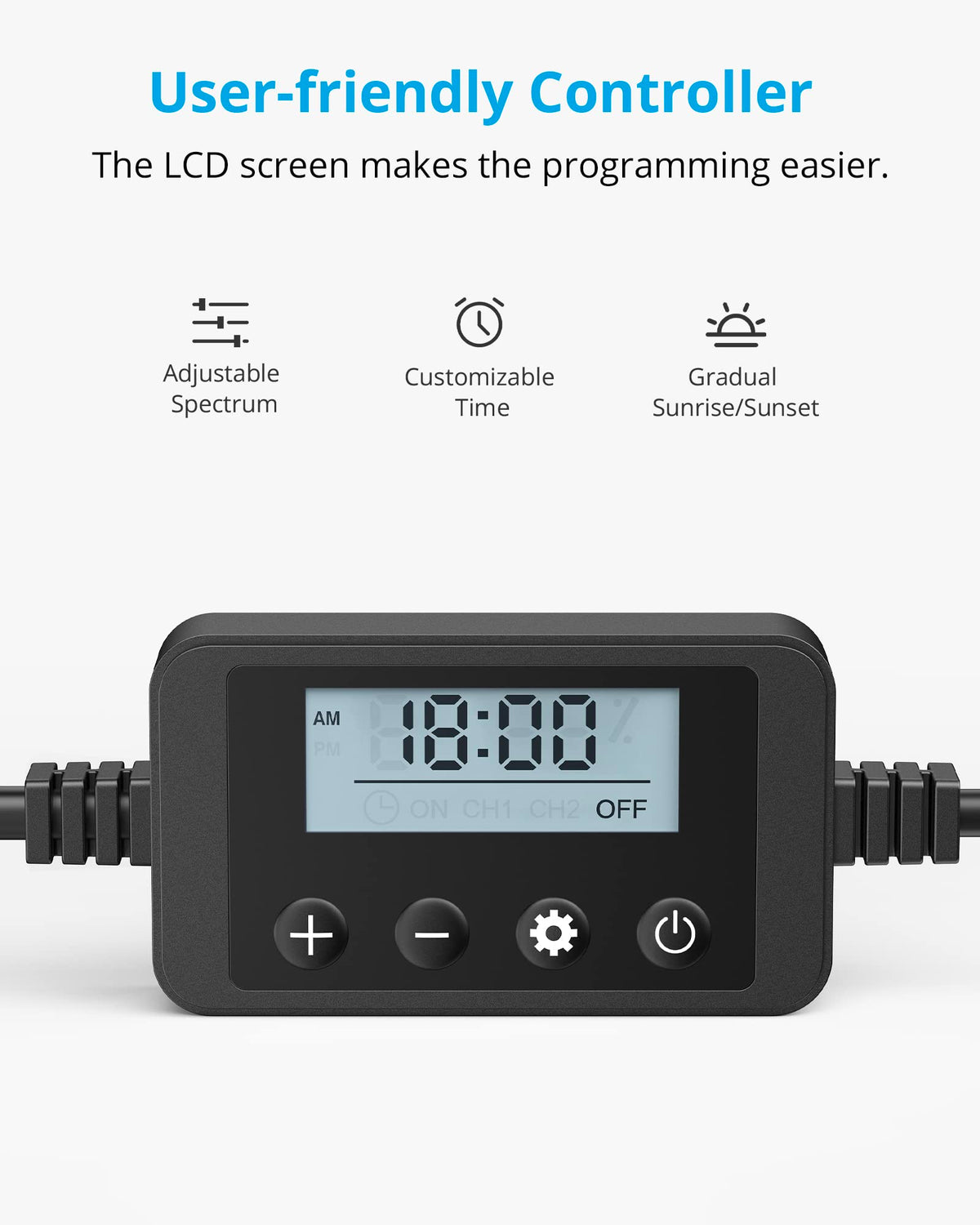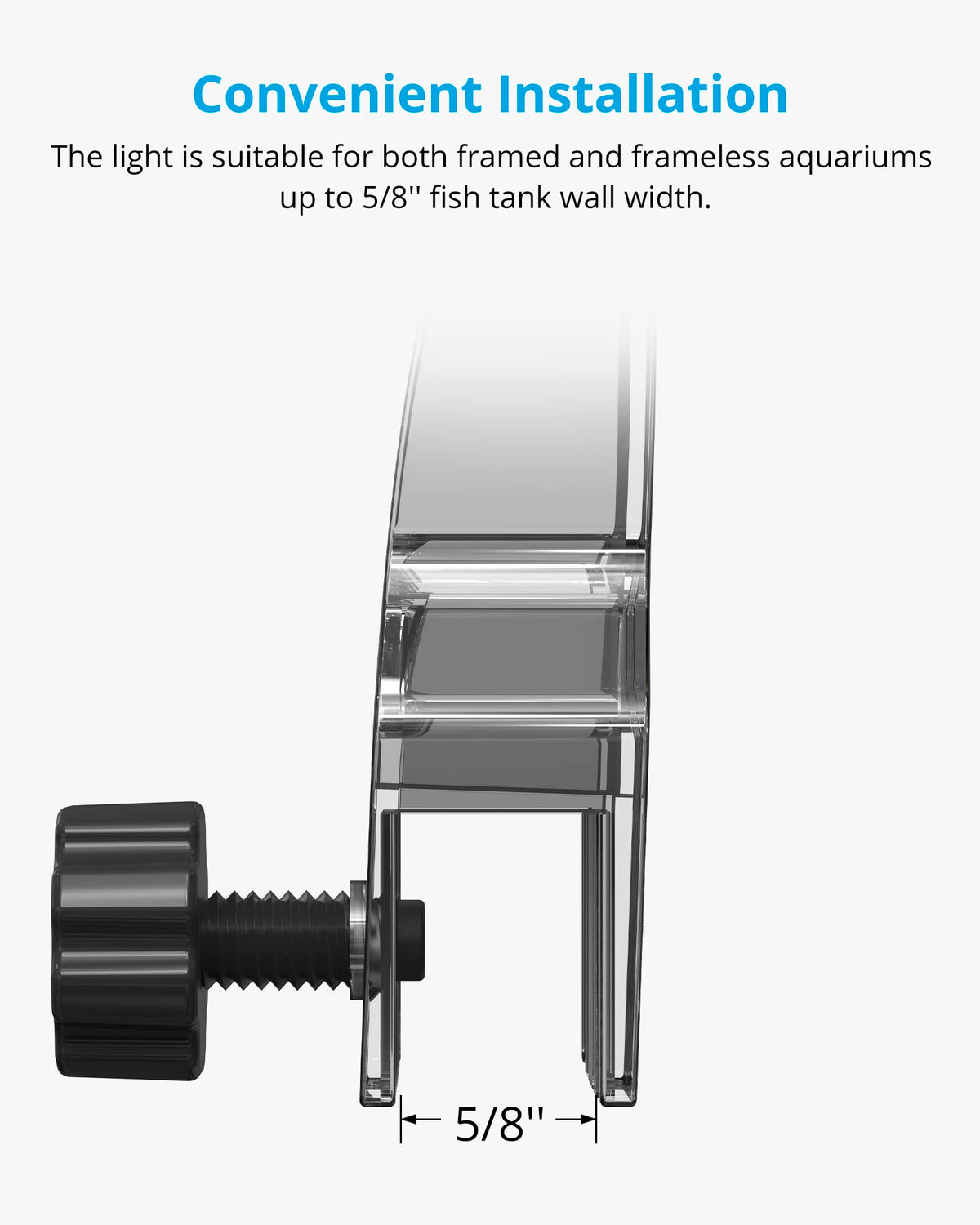 The clip light allows accurate views of plants invertebrates and fish in their natural colors producing amazing shimmer to your aquarium Features white blue and red LEDs for daylight mode and blue LEDs only for a nightlight mode For greater customization the brightness of the blue and white LEDs can be adjusted independently from 0% to 100% 30 minutes ramp-up and ramp-down to make creatures better adapt to changes in lighting effects Easily mounts on and secured to the glass of framed or frameless aquariums up to 58 with the clip on bracket design This clamp aquarium light is suitable for planted tanks from 25 to 5 gallons