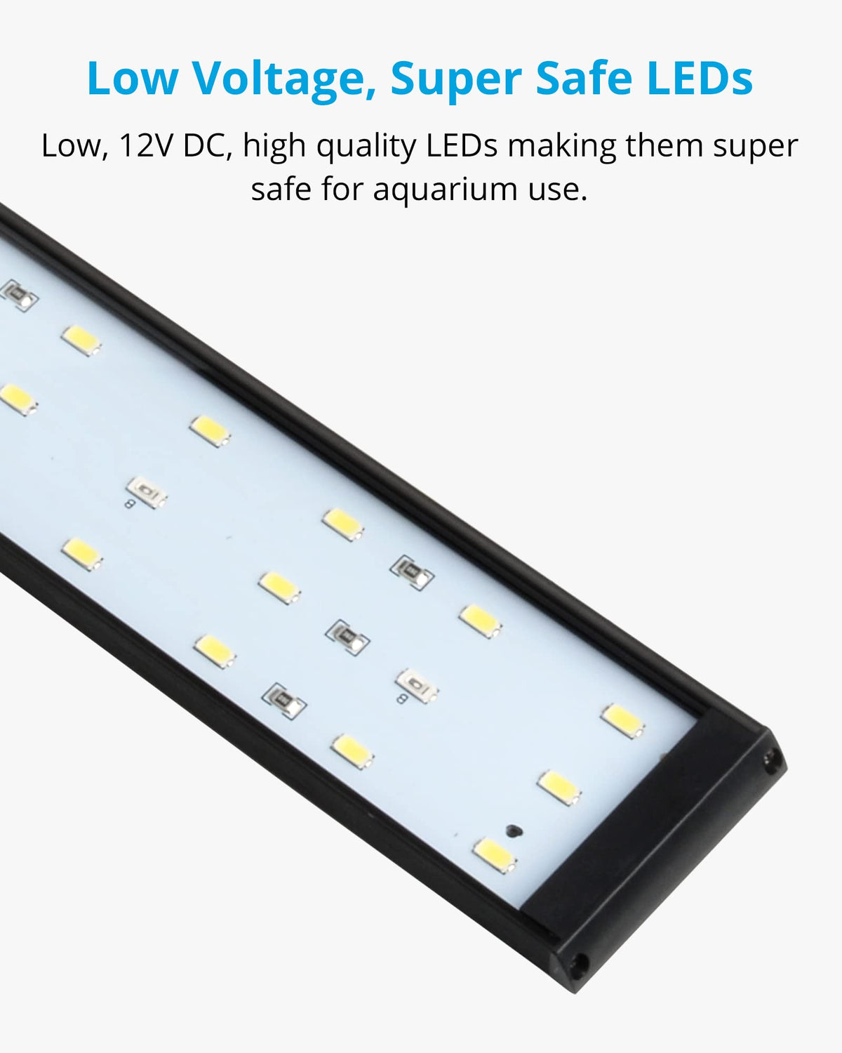Perfect Choice For Nano Aquarium Sleek modern design, with durable aluminum and molded plastic construction, allows for a clean presentation that complements the look of any aquarium. Adjustable Telescoping Arms The sliding mounting legs allow quick and easy adjustments. Fits for different open tank size. Specifications Product Dimensions: 7.2'' X 2'' LED Quantity: 18 LEDs (15 White + 3 Blue) Light Mode: All LEDs On Color Temperature: approx. 6500K Cable Length: 4 ft Wattage: 7 W Input: AC 100-240V 0.3A 50/60 HzOutput: DC 12V 1A
